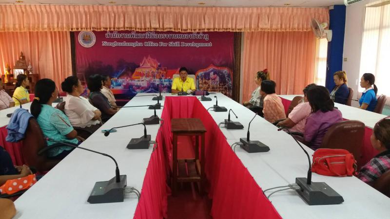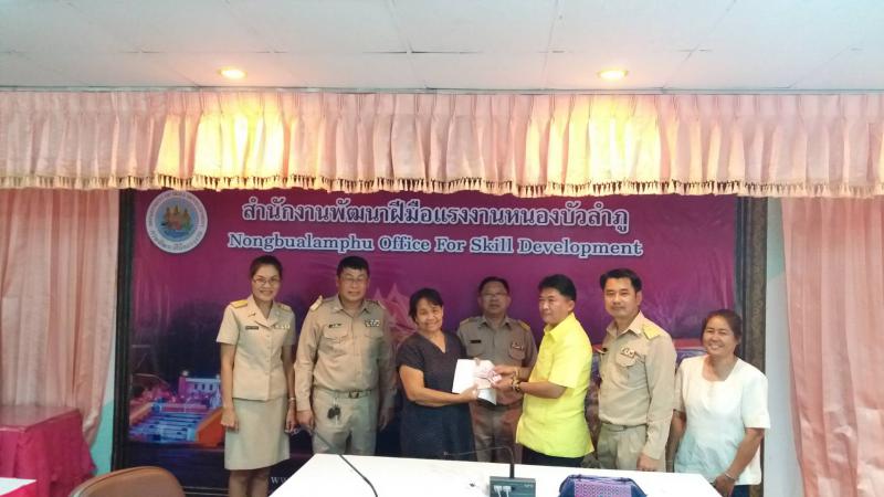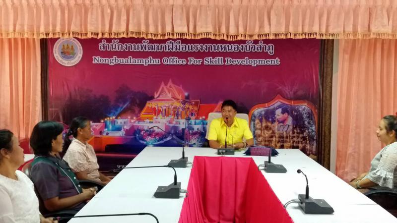 วันจันทร์ที่ 18 มิถุนายน 2561 เวลา 13.00 -16.00 น. นายอำนาจ เชิงไว แรงงานจังหวัดหนองบัวลำภู นายประทีป นุ่นชื่น ผู้อำนวยการสำนักงานพัฒนาฝีมือแรงงานจังหวัดหนองบัวลำภู และผู้แทนหน่วยงานสังกัดกระทรวงแรงงานจังหวัดหนองบัวลำภู ร่วมบรรยายให้ความรู้ เรื่องนโยบายของรัฐบาลนโยบายกระทรวงแรงงาน และภารกิจของหน่วยงานสังกัดกระทรวงแรงงานจังหวัดหนองบัวลำภู พร้อมทั้งมอบวุฒิบัตร และเงินค่าเบี้ยเลี้ยง ให้กับผู้เข้ารับการอบรม หลักสูตรการฝึกอาชีพเสริม สาขาการมัดหมี่ไหมและการทอผ้า 30 ชั่วโมงตามโครงการพัฒนาศักยภาพ ผู้มีรายได้น้อย ที่ลงทะเบียนสวัสดิการแห่งรัฐเพื่อสร้างงานสร้างอาชีพเพิ่มรายได้และความมั่นคงในชีวิต ประจำปีงบประมาณพ. ศ. 2561 ณห้องประชุมชั้น 2 ตึกอำนวยการสำนักงานพัฒนาฝีมือแรงงานหนองบัวลําภู