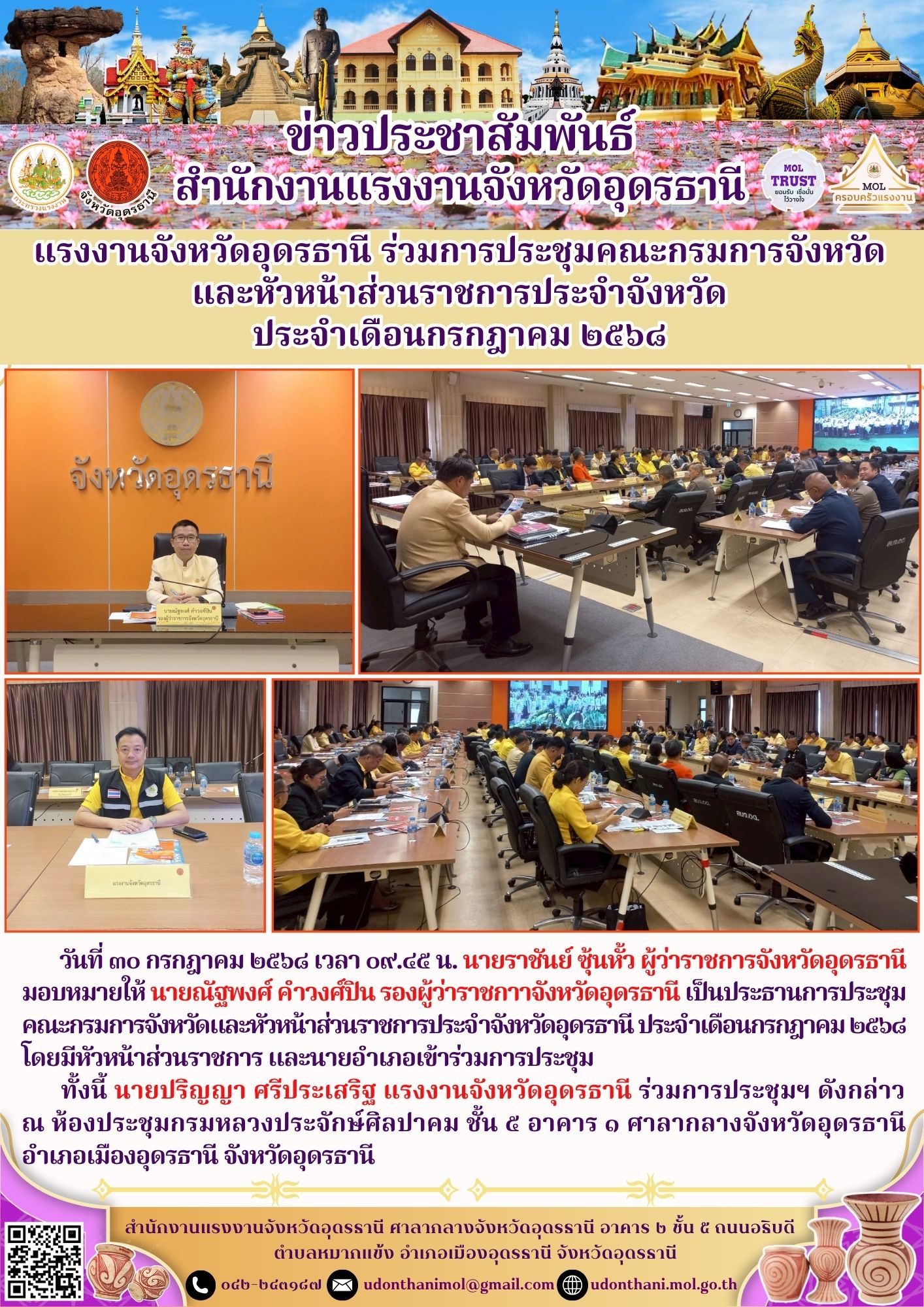 แรงงานจังหวัดอุดรธานี ร่วมการประชุมคณะกรมการจังหวัดและหัวหน้าส่วนราชการประจำจังหวัด ประจำเดือนกรกฎาคม ๒๕๖๘