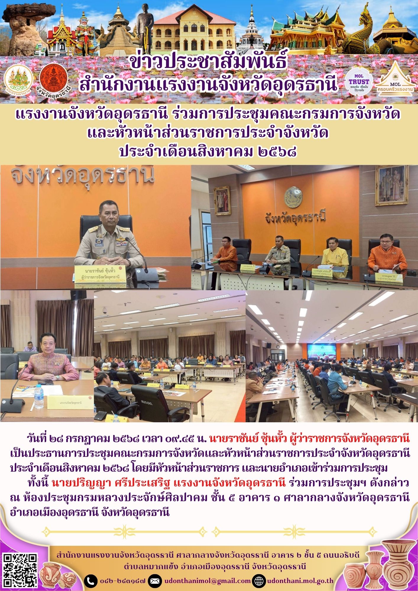 แรงงานจังหวัดอุดรธานี ร่วมการประชุมคณะกรมการจังหวัดและหัวหน้าส่วนราชการประจำจังหวัด ประจำเดือนสิงหาคม ๒๕๖๘