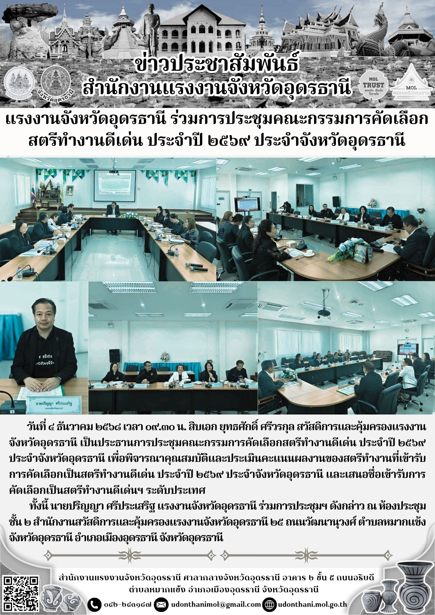 แรงงานจังหวัดอุดรธานี ร่วมการประชุมคณะกรรมการคัดเลือกสตรีทำงานดีเด่น ประจำปี ๒๕๖๙ ประจำจังหวัดอุดรธานี