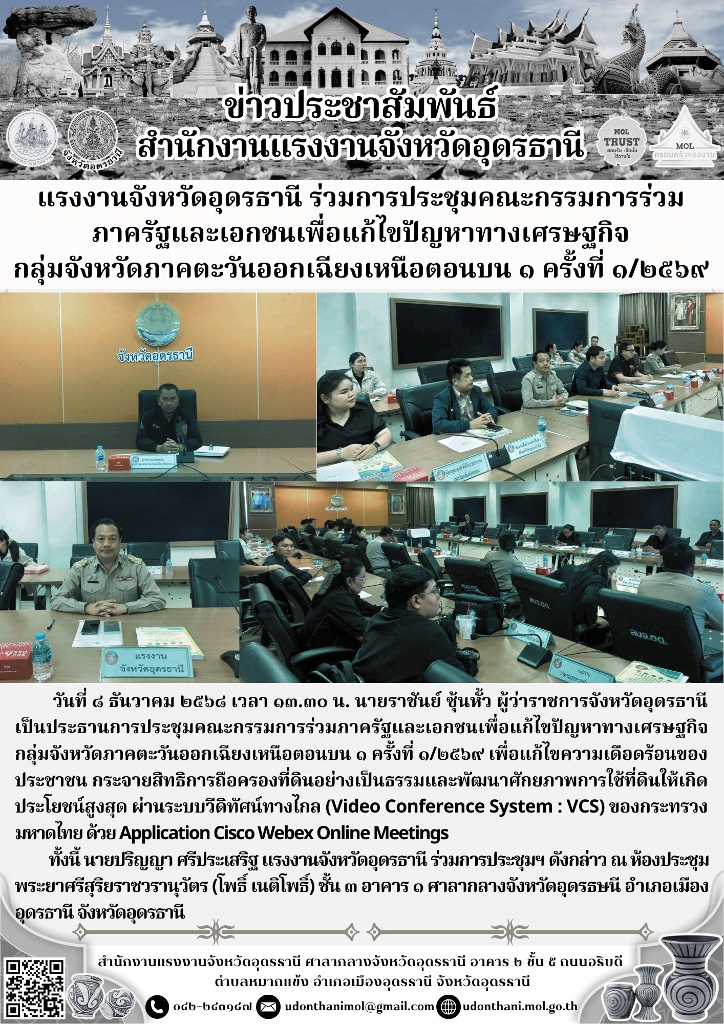 แรงงานจังหวัดอุดรธานี ร่วมการประชุมคณะกรรมการร่วม ภาครัฐและเอกชนเพื่อแก้ไขปัญหาทางเศรษฐกิจกลุ่มจังหวัดภาคตะวันออกเฉียงเหนือตอนบน ๑ ครั้งที่ ๑/๒๕๖๙