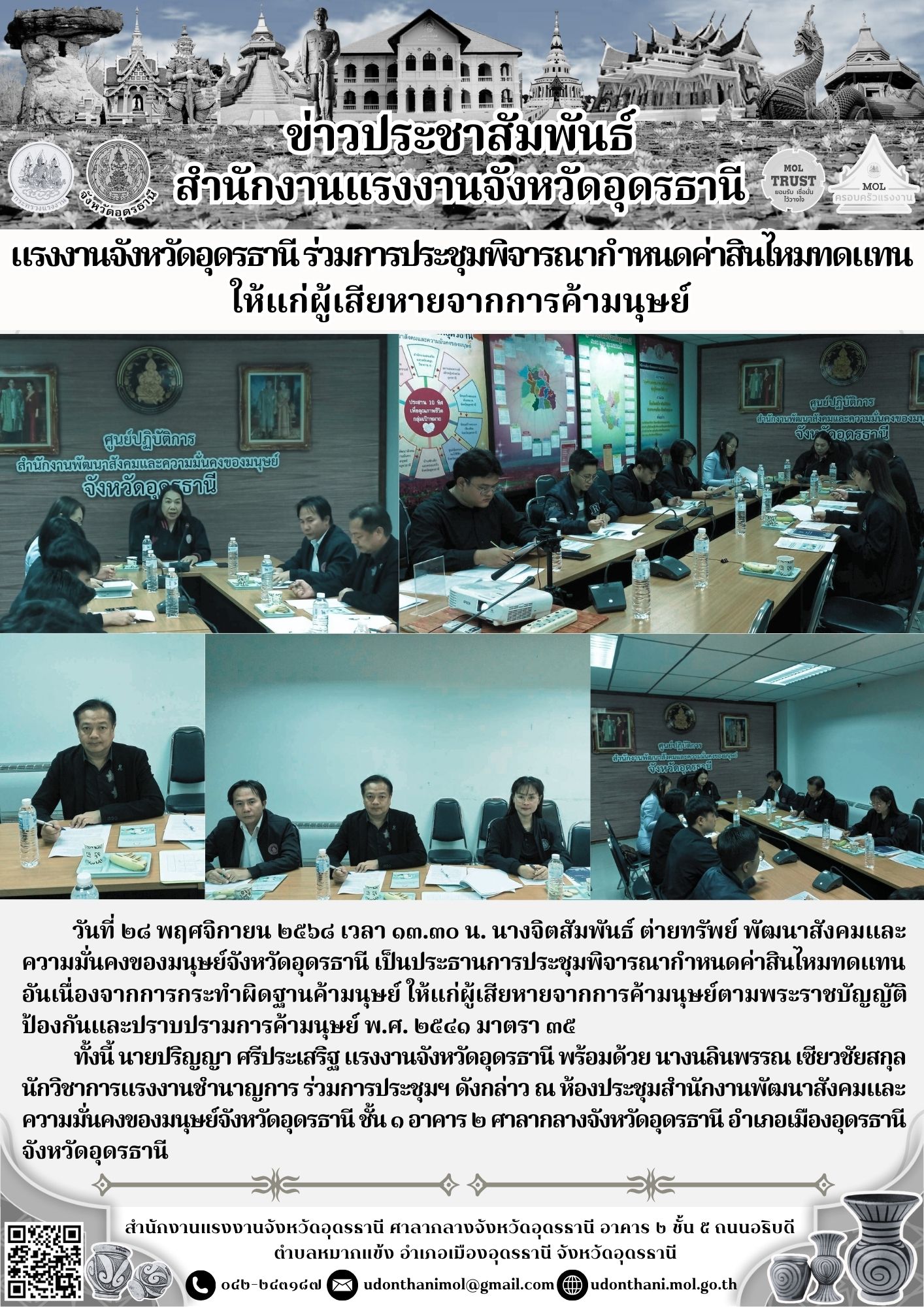 แรงงานจังหวัดอุดรธานี ร่วมการประชุมพิจารณากำหนดค่าสินไหมทดแทนให้แก่ผู้เสียหายจากการค้ามนุษย์