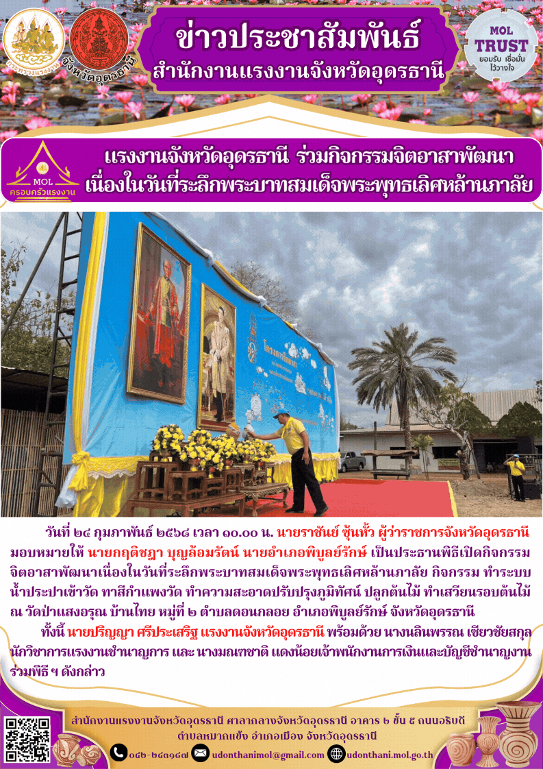 แรงงานจังหวัดอุดรธานี ร่วมกิจกรรมจิตอาสาพัฒนาเนื่องในวันที่ระลึกพระบาทสมเด็จพระพุทธเลิศหล้านภาลัย