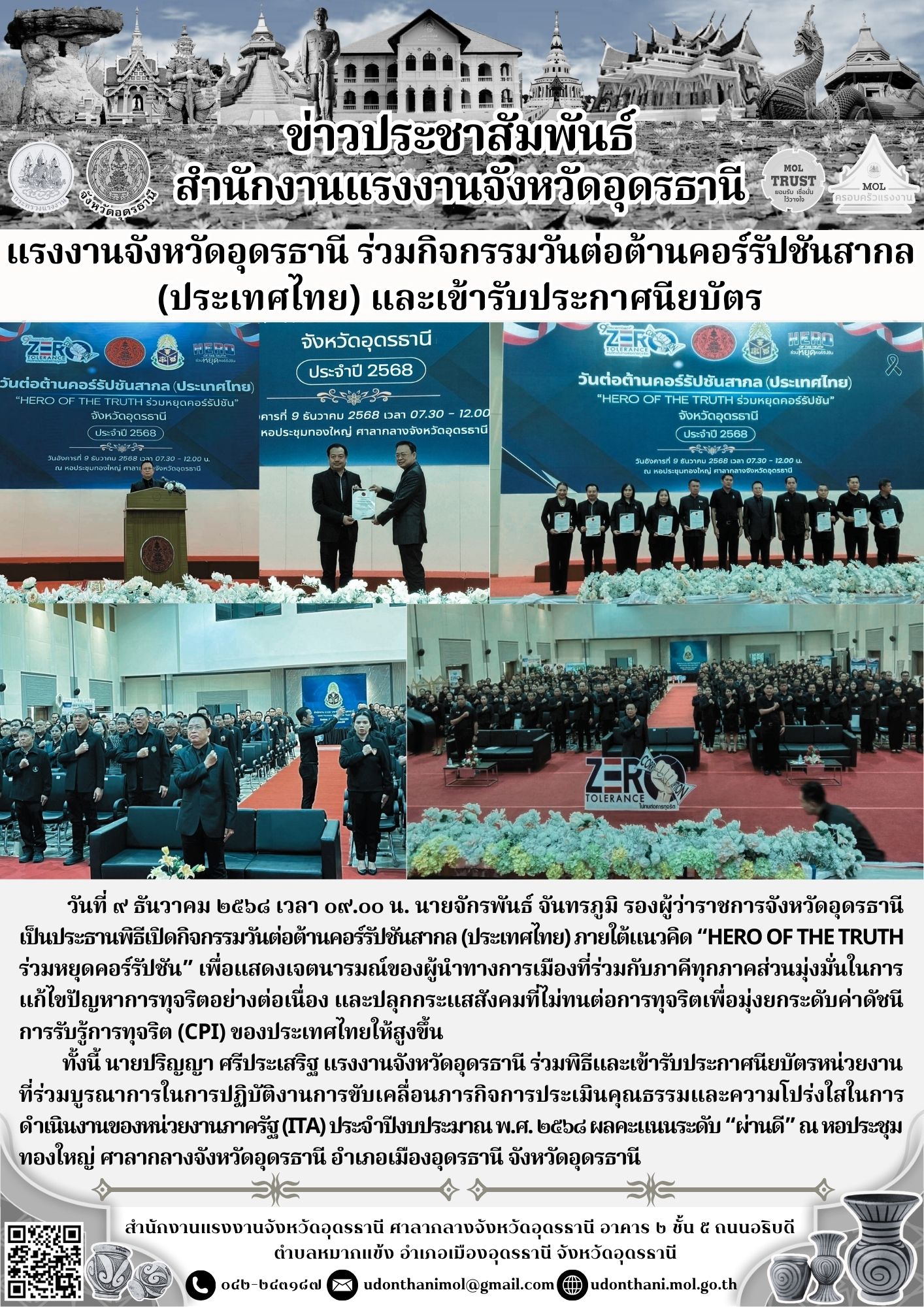 แรงงานจังหวัดอุดรธานี ร่วมกิจกรรมวันต่อต้านคอร์รัปชันสากล (ประเทศไทย) และเข้ารับประกาศนียบัตร
