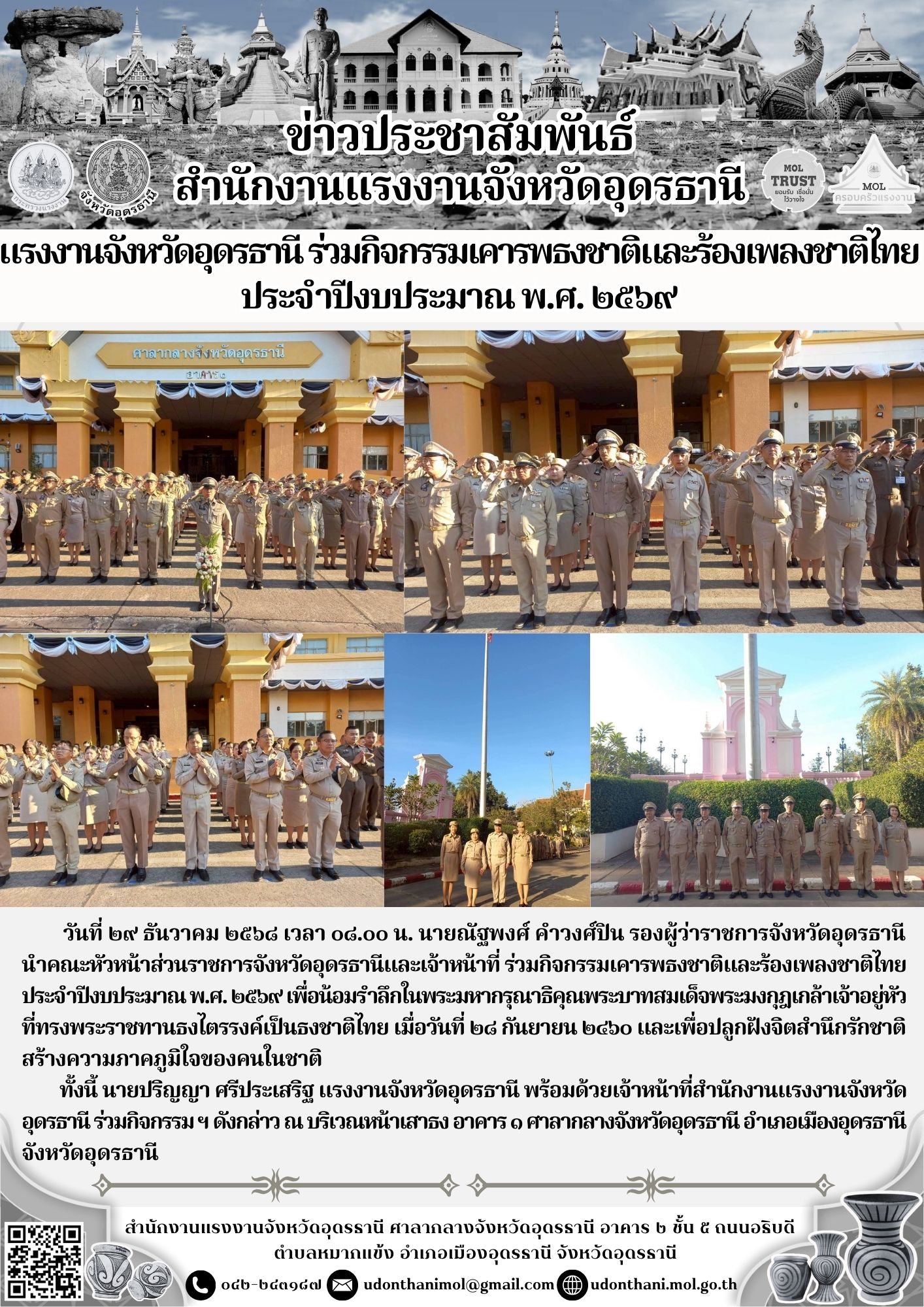 แรงงานจังหวัดอุดรธานี ร่วมกิจกรรมเคารพธงชาติและร้องเพลงชาติไทย ประจำปีงบประมาณ พ.ศ. ๒๕๖๙