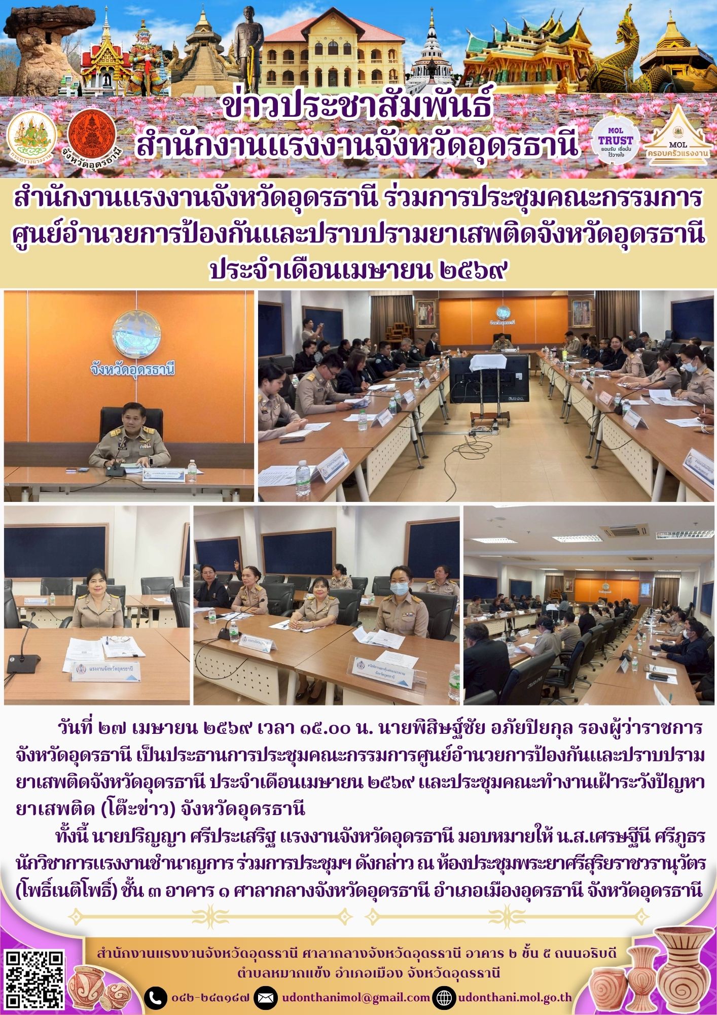 สำนักงานแรงงานจังหวัดอุดรธานี ร่วมการประชุมคณะกรรมการ ศูนย์อำนวยการป้องกันและปราบปรามยาเสพติดจังหวัดอุดรธานี ประจำเดือนเมษายน ๒๕๖๙