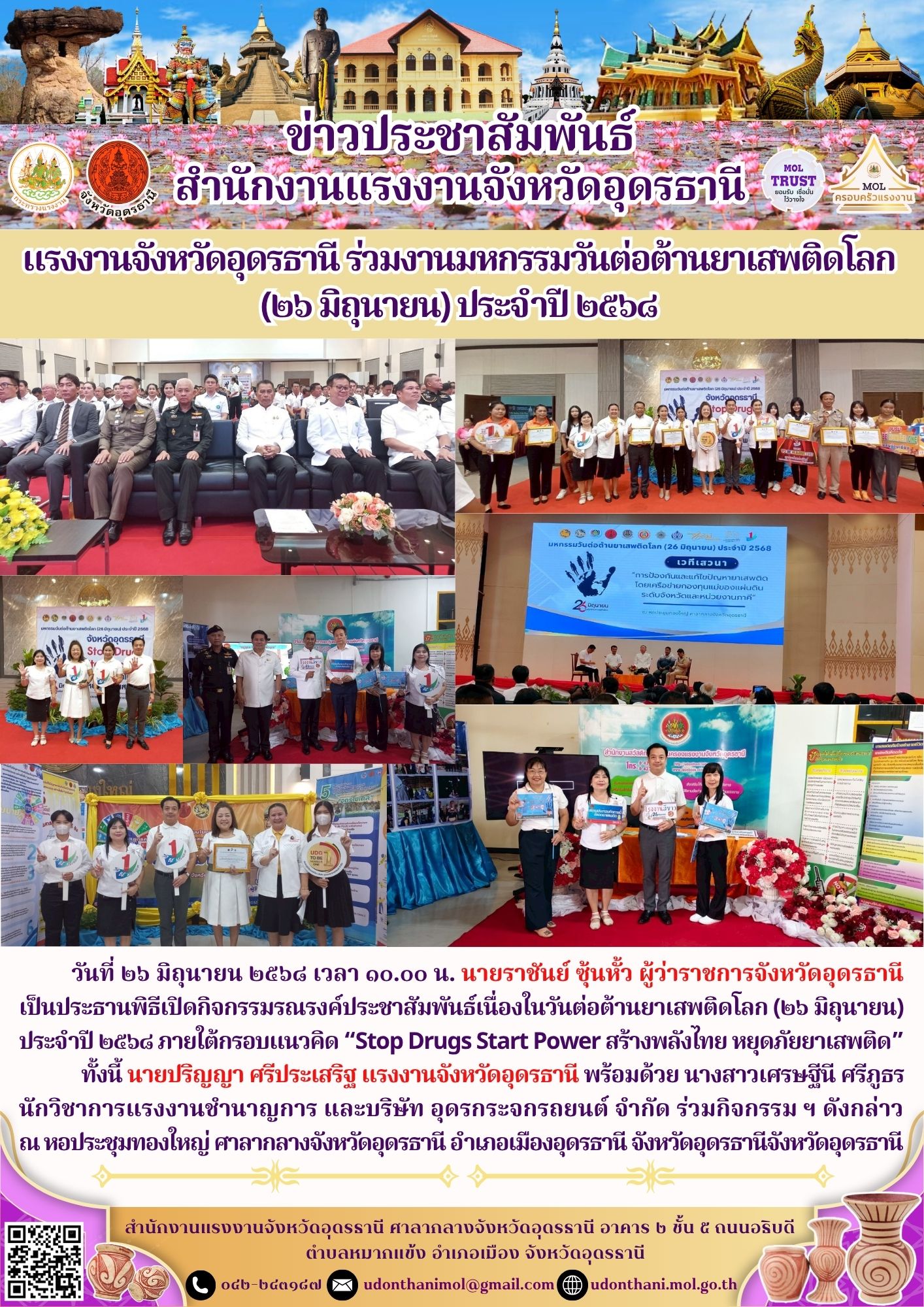 แรงงานจังหวัดอุดรธานี ร่วมงานมหกรรมวันต่อต้านยาเสพติดโลก (๒๖ มิถุนายน) ประจำปี ๒๕๖๘