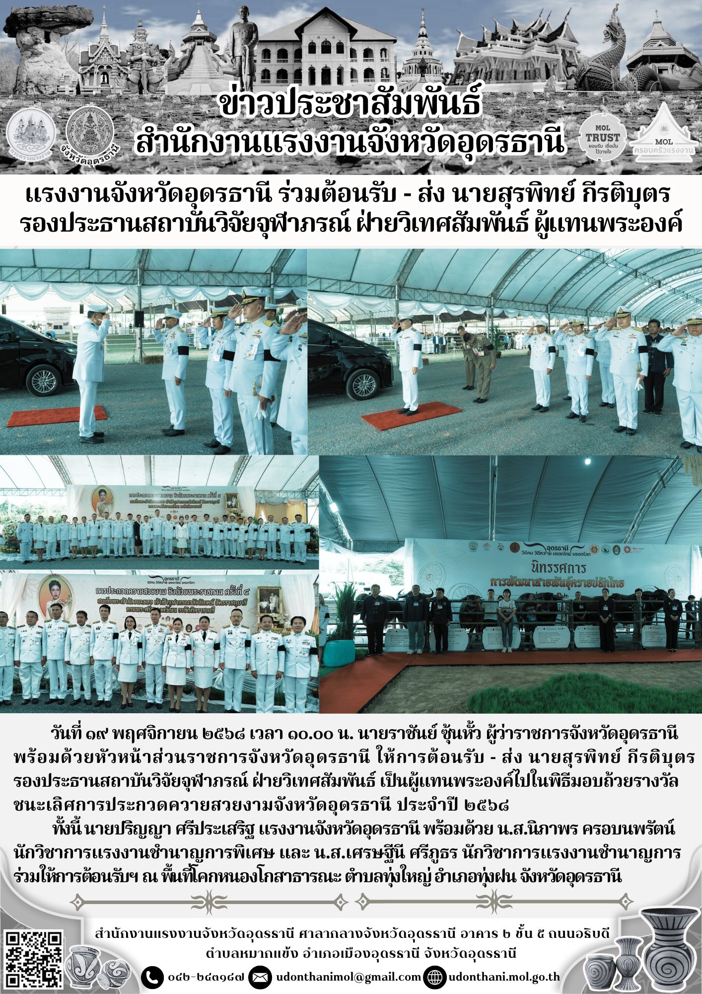 แรงงานจังหวัดอุดรธานี ร่วมต้อนรับ – ส่ง นายสุรพิทย์ กีรติบุตร รองประธานสถาบันวิจัยจุฬาภรณ์ ฝ่ายวิเทศสัมพันธ์ ผู้แทนพระองค์