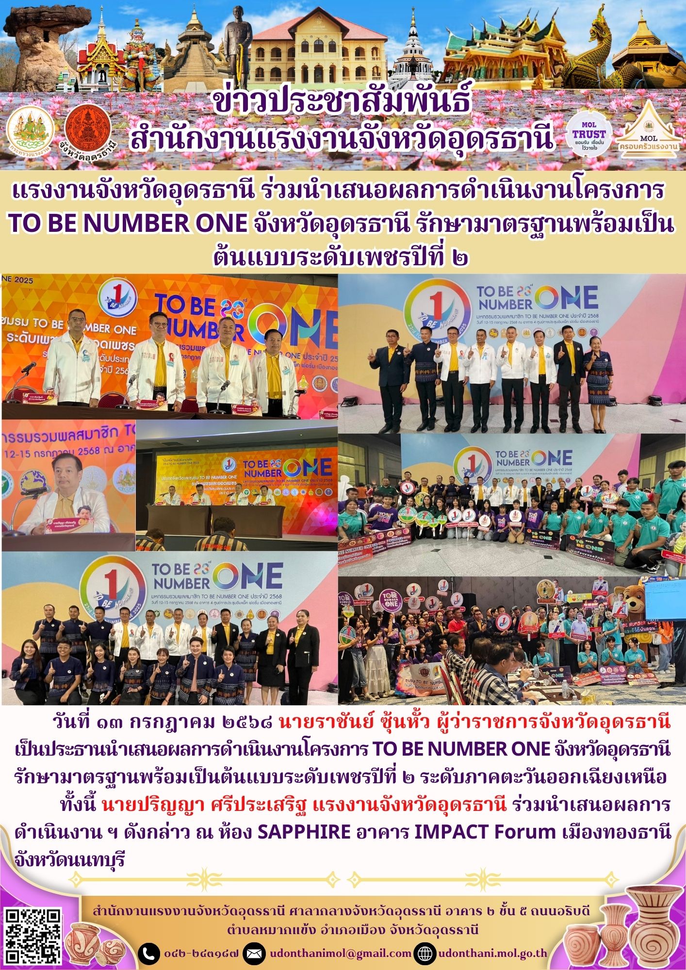แรงงานจังหวัดอุดรธานี ร่วมนำเสนอผลการดำเนินงานโครงการ TO BE NUMBER ONE จังหวัดอุดรธานี รักษามาตรฐานพร้อมเป็นต้นแบบระดับเพชรปีที่ ๒