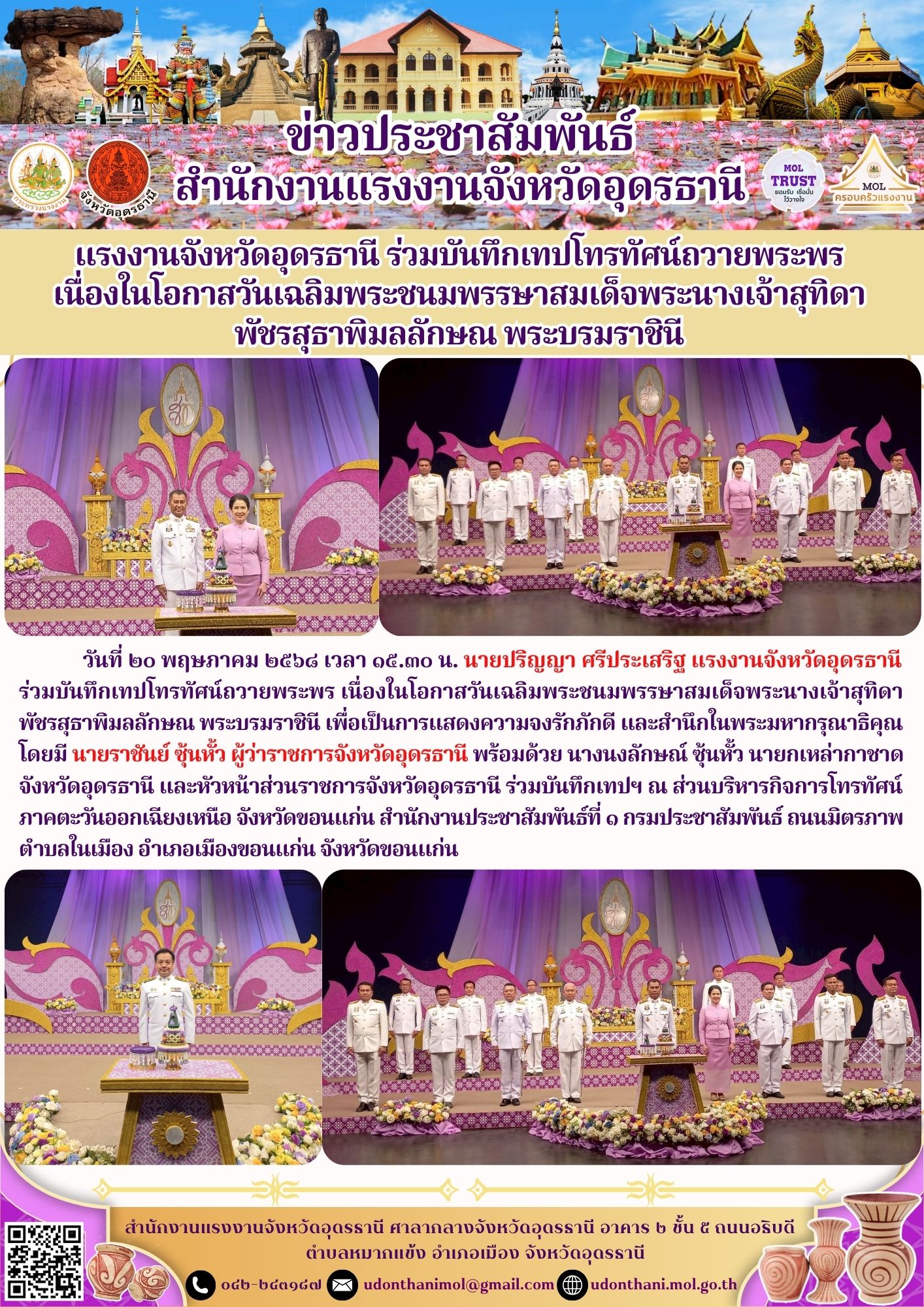 แรงงานจังหวัดอุดรธานี ร่วมบันทึกเทปโทรทัศน์ถวายพระพร เนื่องในโอกาสวันเฉลิมพระชนมพรรษาสมเด็จพระนางเจ้าสุทิดา พัชรสุธาพิมลลักษณ พระบรมราชินี
