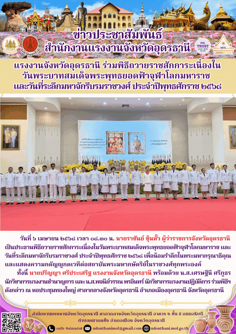 แรงงานจังหวัดอุดรธานี ร่วมพิธีถวายราชสักการะเนื่องในวันพระบาทสมเด็จพระพุทธยอดฟ้าจุฬาโลกมหาราชและวันที่ระลึกมหาจักรีบรมราชวงศ์ ประจำปีพุทธศักราช ๒๕๖๘