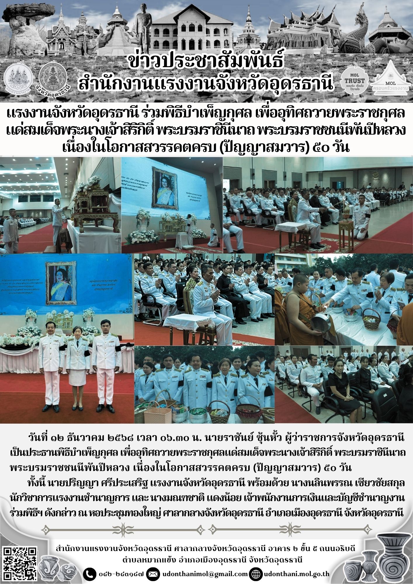 แรงงานจังหวัดอุดรธานี ร่วมพิธีบำเพ็ญกุศล เพื่ออุทิศถวายพระราชกุศล แด่สมเด็จพระนางเจ้าสิริกิติ์ พระบรมราชินีนาถ พระบรมราชชนนีพันปีหลวงเนื่องในโอกาสสวรรคตครบ (ปัญญาสมวาร) ๕๐ วัน