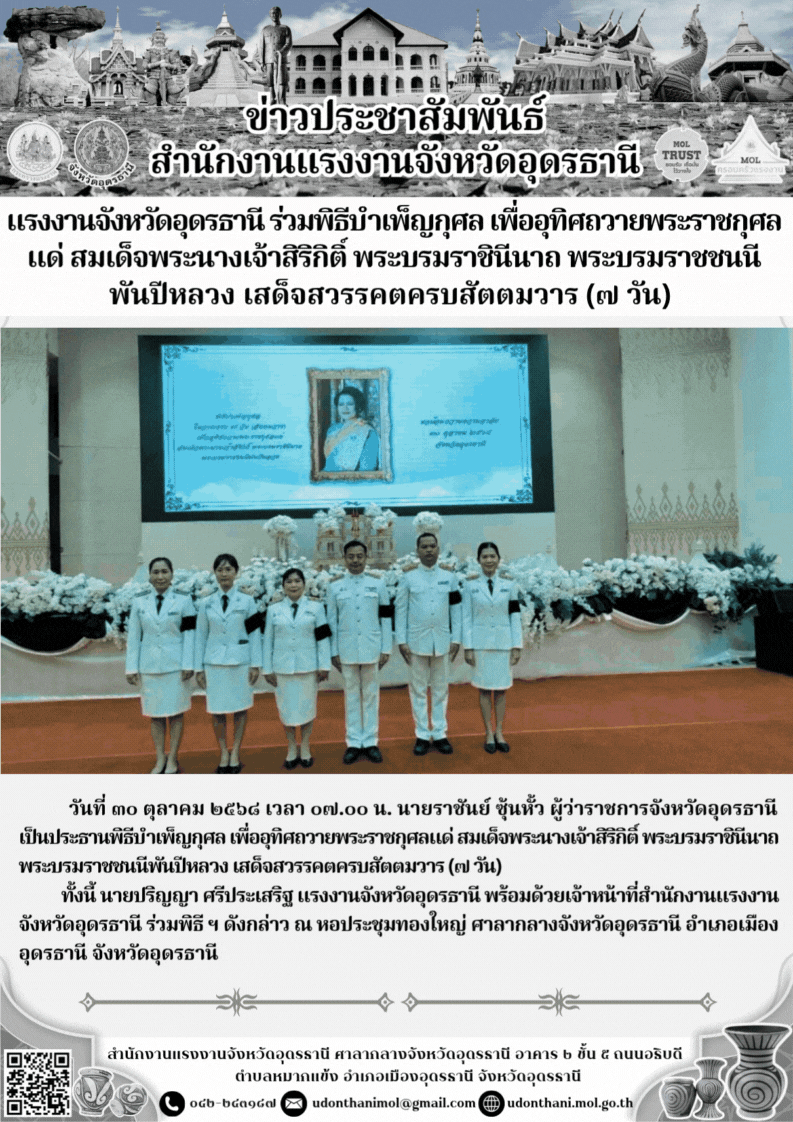 แรงงานจังหวัดอุดรธานี ร่วมพิธีบำเพ็ญกุศล เพื่ออุทิศถวายพระราชกุศล แด่ สมเด็จพระนางเจ้าสิริกิติ์ พระบรมราชินีนาถ พระบรมราชชนนี พันปีหลวง เสด็จสวรรคตครบสัตตมวาร (๗ วัน)