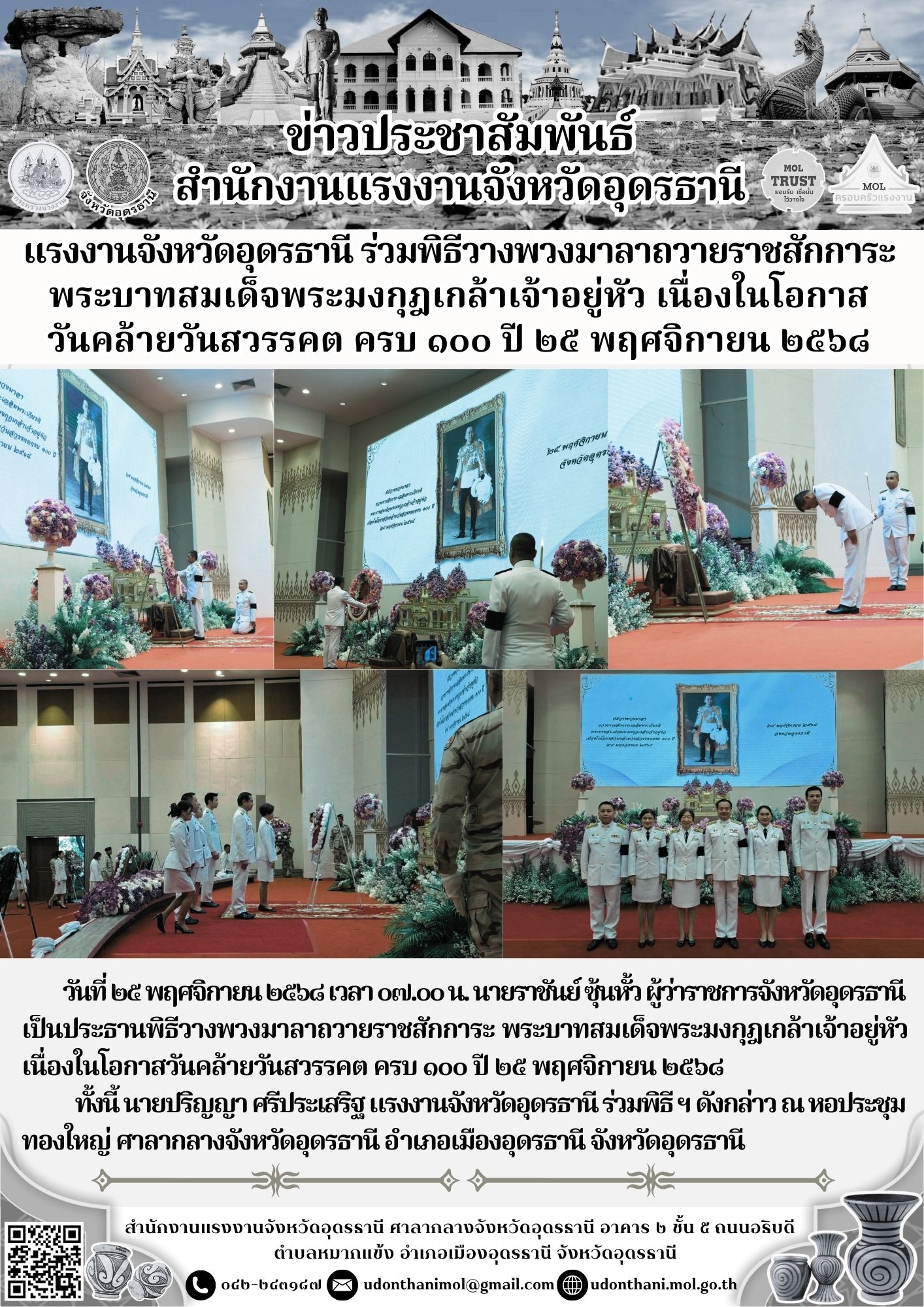 แรงงานจังหวัดอุดรธานี ร่วมพิธีวางพวงมาลาถวายราชสักการะ พระบาทสมเด็จพระมงกุฎเกล้าเจ้าอยู่หัว เนื่องในโอกาสวันคล้ายวันสวรรคต ครบ ๑๐๐ ปี ๒๕ พฤศจิกายน ๒๕๖๘
