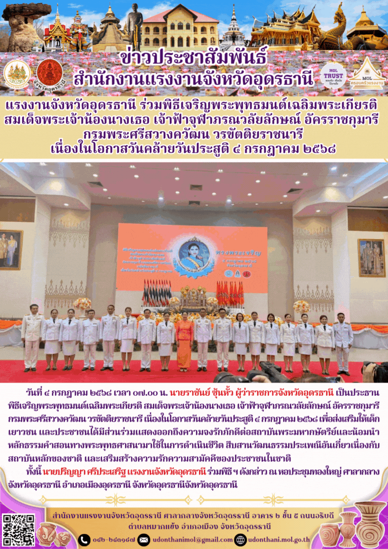 แรงงานจังหวัดอุดรธานี ร่วมพิธีเจริญพระพุทธมนต์เฉลิมพระเกียรติ สมเด็จพระเจ้าน้องนางเธอ เจ้าฟ้าจุฬาภรณวลัยลักษณ์ อัครราชกุมารี กรมพระศรีสวางควัฒน วรขัตติยราชนารี เนื่องในโอกาสวันคล้ายวันประสูติ ๔ กรกฎาคม ๒๕๖๘