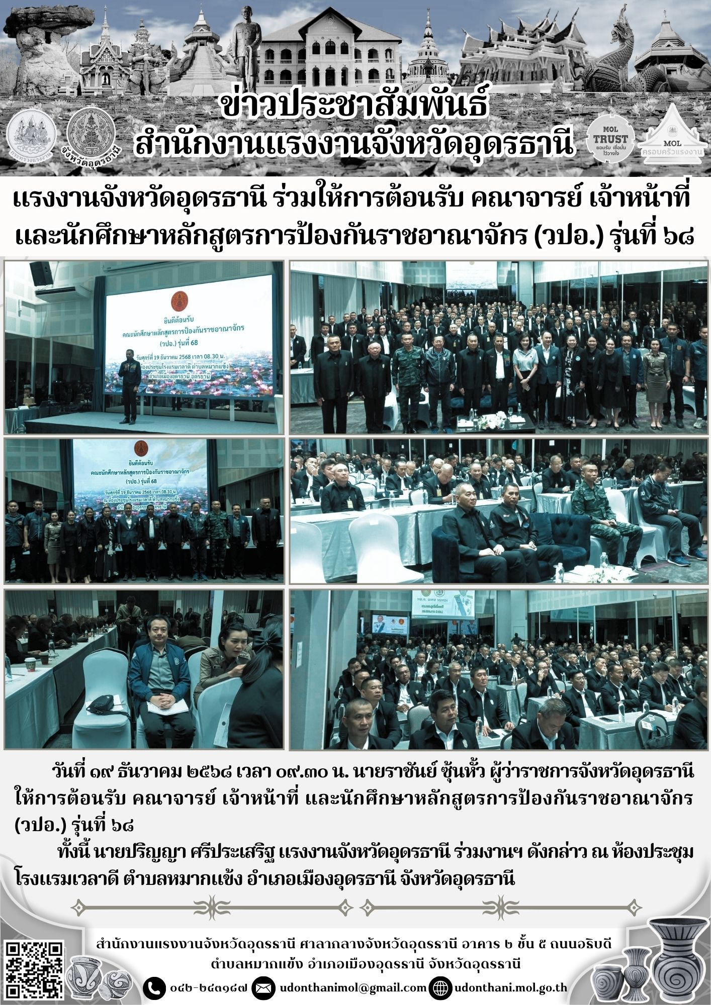 แรงงานจังหวัดอุดรธานี ร่วมให้การต้อนรับ คณาจารย์ เจ้าหน้าที่ และนักศึกษาหลักสูตรการป้องกันราชอาณาจักร (วปอ.) รุ่นที่ ๖๘