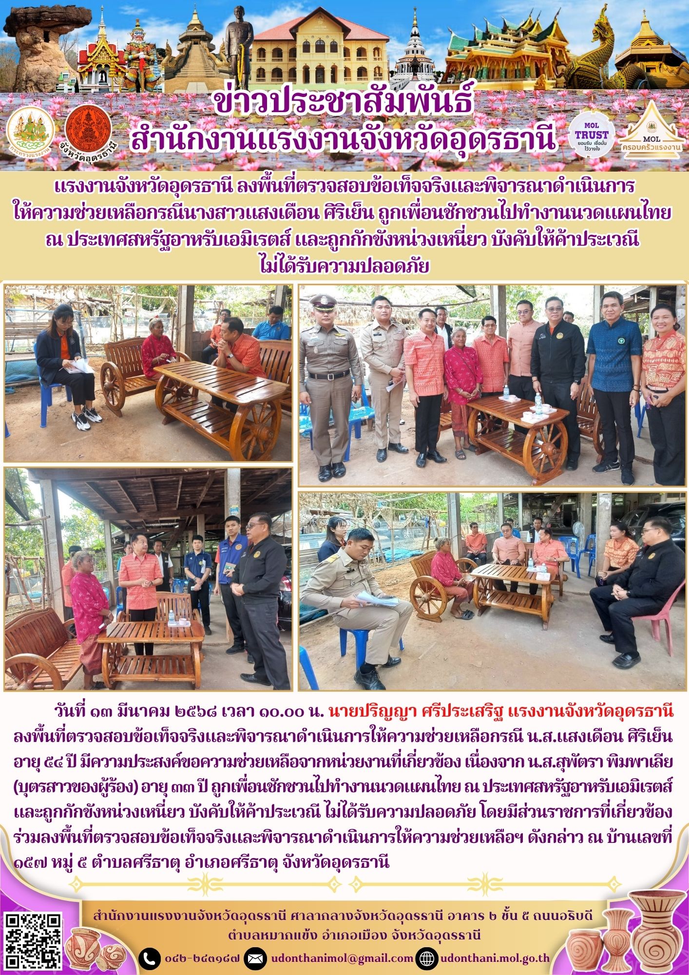 แรงงานจังหวัดอุดรธานี ลงพื้นที่ตรวจสอบข้อเท็จจริงและพิจารณาดำเนินการให้ความช่วยเหลือกรณีนางสาวแสงเดือน ศิริเย็น ถูกเพื่อนชักชวนไปทำงานนวดแผนไทย ณ ประเทศสหรัฐอาหรับเอมิเรตส์และถูกกักขังหน่วงเหนี่ยว บังคับให้ค้าประเวณี ไม่ได้รับความปลอดภัย