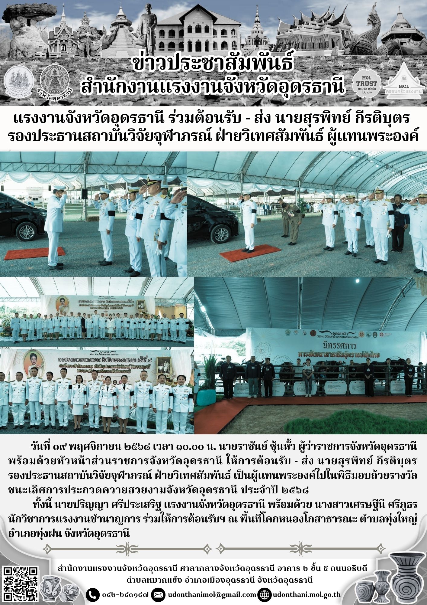 แรงงานจังหวัดอุดรธานี ร่วมต้อนรับ – ส่ง นายสุรพิทย์ กีรติบุตร รองประธานสถาบันวิจัยจุฬาภรณ์ ฝ่ายวิเทศสัมพันธ์ ผู้แทนพระองค์