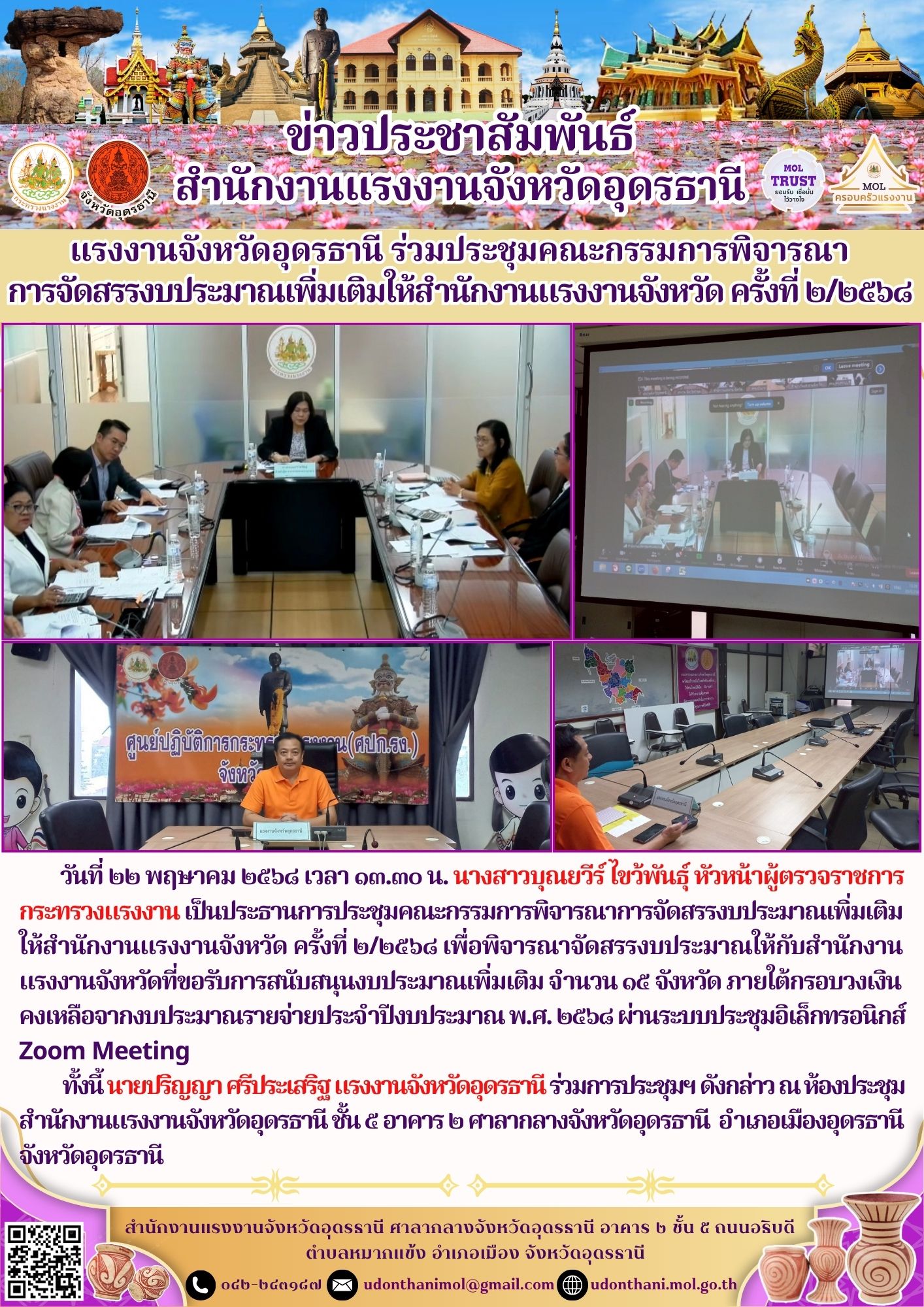 แรงงานจังหวัดอุดรธานี ร่วมประชุมคณะกรรมการพิจารณา การจัดสรรงบประมาณเพิ่มเติมให้สำนักงานแรงงานจังหวัด ครั้งที่ ๒/๒๕๖๘