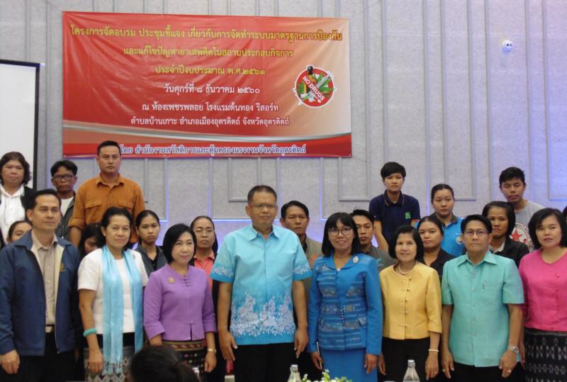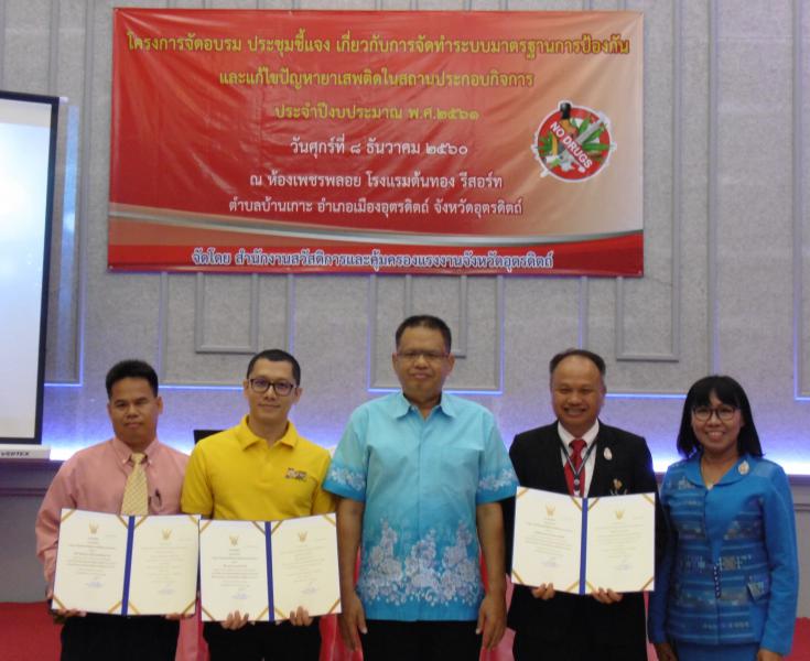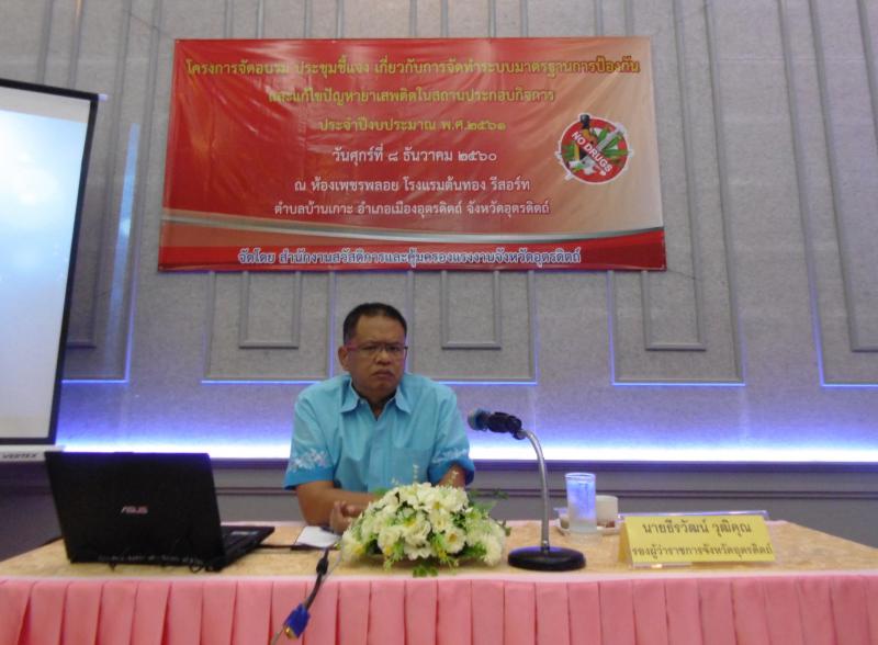 เมื่อวันศุกร์ที่ 8 ธันวาคม 2560 เวลา 09.00 น. นางสาวปาริชาติ สวนใจ แรงงานจังหวัดอุตรดิตถ์ ร่วมพิธีเปิดการอบรมการจัดทำระบบมาตรฐานการป้องกันและแก้ไขปัญหายาเสพติดในสถานประกอบกิจการ (มยส) ประจำปีงบประมาณ พ.ศ.2561 ณ ห้องเพชรพลอย โรงแรมต้นทอง รีสอร์ท ตำบลบ้านเกาะ อำเภอเมืองอุตรดิตถ์ โดยมีนายธีรวัฒน์ วุฒิคุณ รองผู้ว่าราชการจังหวัดอุตรดิตถ์ เป็นประธานในพิธี