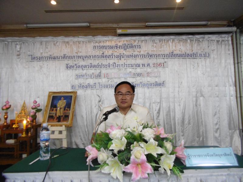 เมื่อวันพุธที่ 15 พฤศจิกายน 2560 เวลา 08.30 น. นางสาวปาริชาติ สวนใจ แรงงานจังหวัดอุตรดิตถ์ ร่วมอบรมเชิงปฏิบัติการ "โครงการพัฒนาศักยภาพบุคลากรเพื่อสร้างผู้นำแห่งการบริหารการเปลี่ยนแปลงจังหวัดอุตรดิตถ์ (ป.ย.ป.) ประจำปีงบประมาณ พ.ศ.2561 ระหว่างวันที่ 15-16 พ.ย.2560 ณ ห้องกินรี โรงแรมสีหราช อำเภอเมืองอุตรดิตถ์ โดยนายเสฐียรพงศ์ มากศิริ ผู้ว่าราชการจังหวัดอุตรดิตถ์ เป็นประธาน