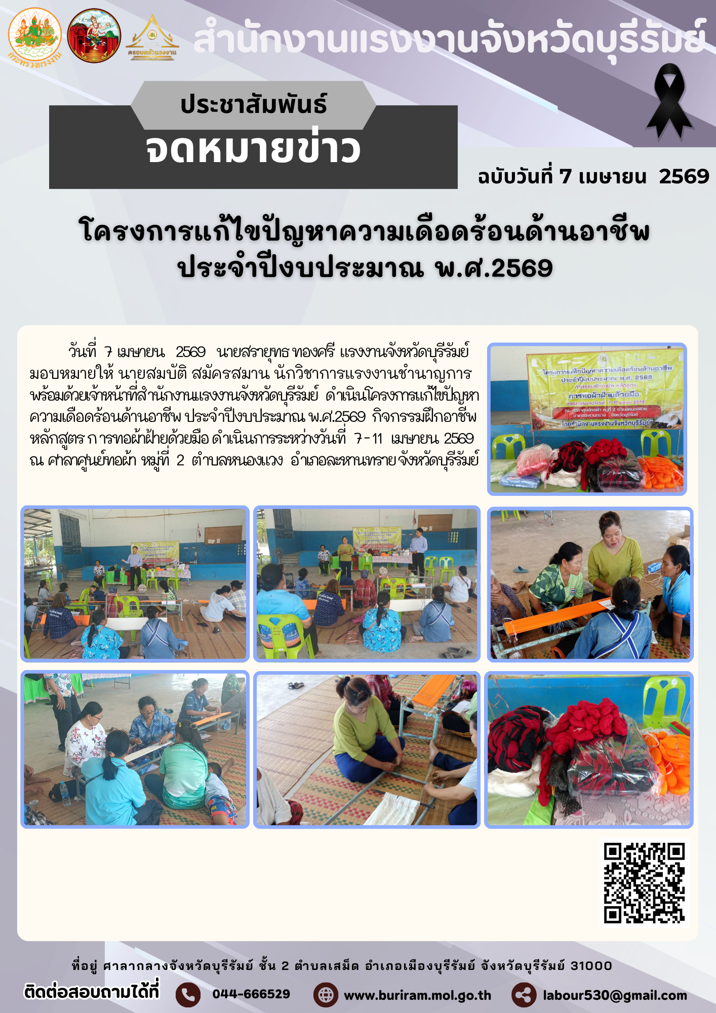 สำนักงานแรงงานจังหวัดบุรีรัมย์ เปิดโครงการแก้ไขปัญหาความเดือดร้อนด้านอาชีพ ประจำปีงบประมาณ พ.ศ.2569