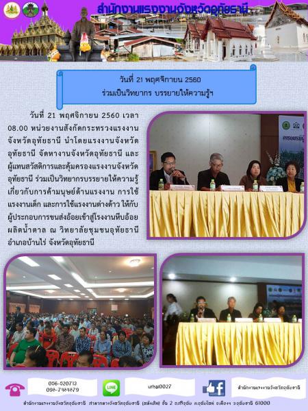 แรงงานจังหวัดอุทัยธานี ร่วมเป็นวิทยากรให้ความรู้เกี่ยวกับการค้ามนุษย์ด้านแรงงาน