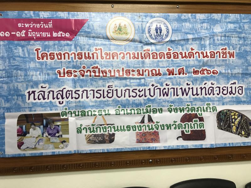 เมื่อวันที่ 11 พฤษภาคม 2561 เวลา 10.00 น. สำนักงานแรงงานจังหวัดภูเก็ต โดยนายสุทธิพงศ์ สายสาคเรศ แรงงานจังหวัดภูเก็ต เปิดโครงการแก้ไขความเดือดร้อนด้านอาชีพ ประจำปีงบประมาณ พ.ศ 2561 หลักสูตร "การเย็บกระเป่าผ้าเพ้นท์ด้วยมือ" ณ คำบลกะรน อ.เมือง จังหวัดภูเก็ต