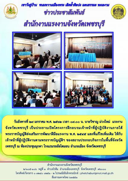 แรงงานจังหวัดเพชรบุรีเป็นประธานเปิดโครงการฝึกอบรมเจ้าหน้าที่ผู้ปฏิบัติงานภายใต้พระราชบัญญัติส่งเสริมการพัฒนาฝีมือแรงงาน พ.ศ. 2545 และที่แก้ไขเพิ่มเติม