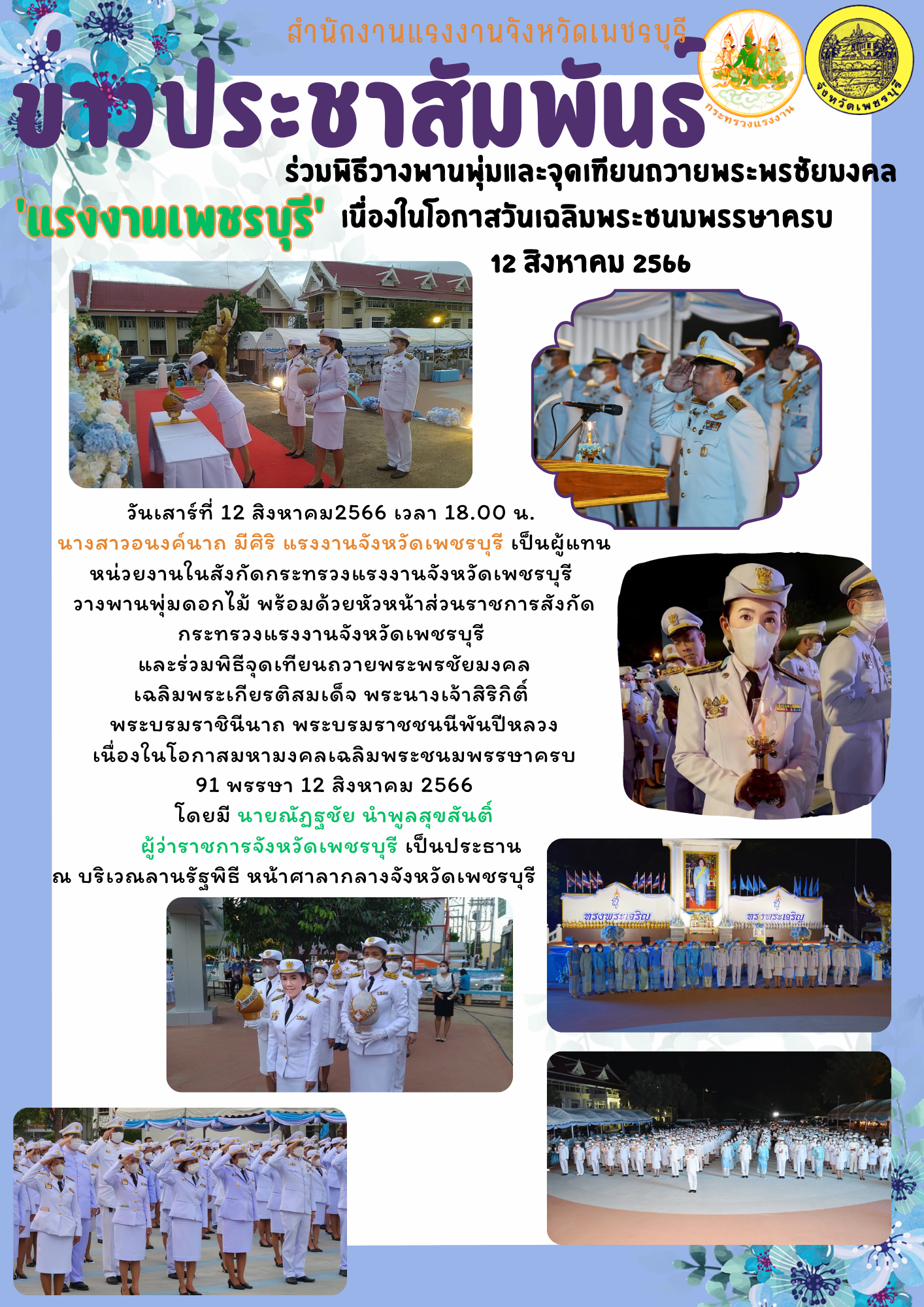 วันเสาร์ที่ 12 สิงหาคม2566 เวลา 18.00 น. นางสาวอนงค์นาถ มีศิริ แรงงานจังหวัดเพชรบุรี เป็นผู้แทนหน่วยงานในสังกัดกระทรวงแรงงานจังหวัดเพชรบุรี วางพานพุ่มดอกไม้ พร้อมด้วยหัวหน้าส่วนราชการสังกัดกระทรวงแรงงานจังหวัดเพชรบุรี และร่วมพิธีจุดเทียนถวายพระพรชัยมงคล เฉลิมพระเกียรติสมเด็จ พระนางเจ้าสิริกิติ์ พระบรมราชินีนาถ พระบรมราชชนนีพันปีหลวง เนื่องในโอกาสมหามงคลเฉลิมพระชนมพรรษาครบ 91 พรรษา 12 สิงหาคม 2566 โดยมี นายณัฏฐชัย นำพูลสุขสันติ์ ผู้ว่าราชการจังหวัดเพชรบุรี เป็นประธาน ณ บริเวณลานรัฐพิธี หน้าศาลากลางจังหวัดเพชรบุรี