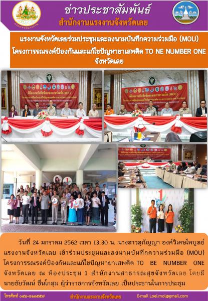 แรงงานจังหวัดเลยร่วมประชุมและลงนามบันทึกความร่วมมือ (MOU) โครงการรณรงค์ป้องกันและแก้ไขปัญหายาเสพติด TO NE NUMBER ONE จังหวัดเลย