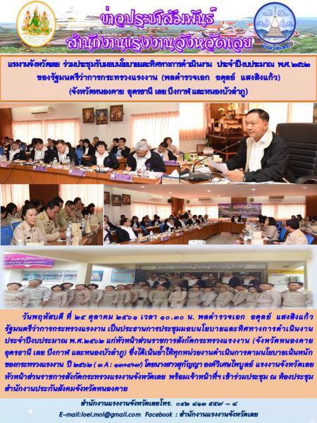 แรงงานจังหวัดเลย ร่วมประชุมรับมอบนโยบายและทิศทางการดำเนินงาน ประจำปีงบประมาณ พ.ศ. 2562 ของรัฐมนตรีว่าการกระทรวงแรงงาน (พลตำรวจเอก อดุลย์ แสงสิงแก้ว)