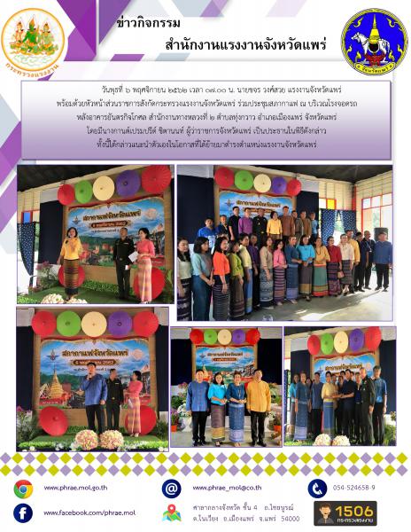 วันพุธที่ 6 พฤศจิกายน 2562 เวลา 07.00 น. นายขจร วงศ์สวย แรงงานจังหวัดแพร่ พร้อมด้วยหัวหน้าส่วนราชการสังกัดกระทรวงแรงงานจังหวัดแพร่ ร่วมประชุมสภากาแฟ ณ บริเวณโรงจอดรถ หลังอาคารยันตรกิจโกศล สำนักงานทางหลวงที่ 2 ต.ทุ่งกวาว อ.เมืองแพร่ จ.แพร่ โดยมีนางกานต์เปรมปรีด์ ชิตานนท์ ผู้ว่าราชการจังหวัดแพร่ เป็นประธานในพิธีดังกล่าว ทั้งนี้ได้กล่าวแนะนำตัวเองในโอกาสที่ได้ย้ายมาดำรงตำแหน่งแรงงานจังหวัดแพร่
