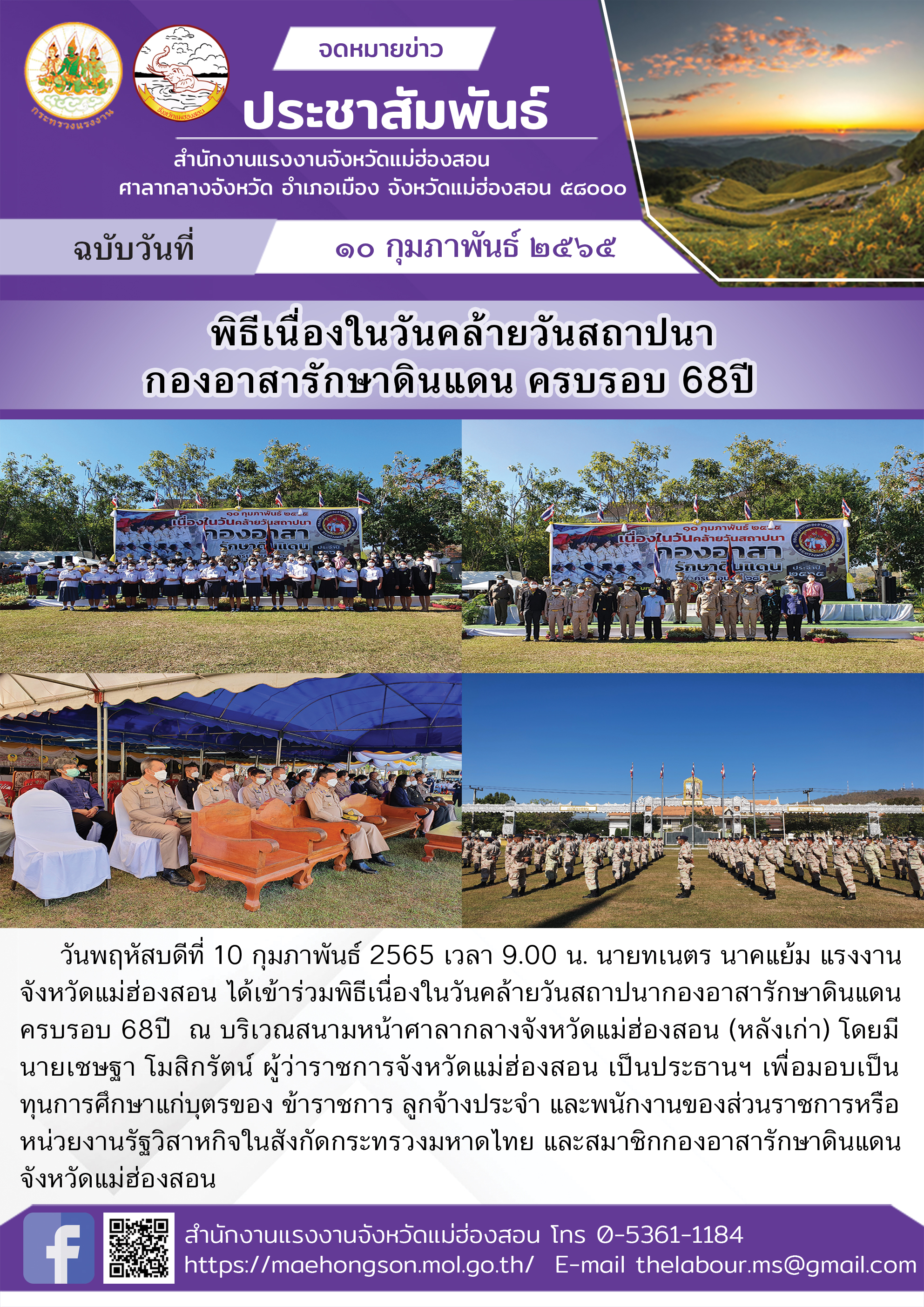 แรงงานจังหวัดแม่ฮ่องสอน เข้าร่วมพิธีเนื่องในวันคล้ายวันสถาปนากองอาสารักษาดินแดน ครบรอบ 68ปี