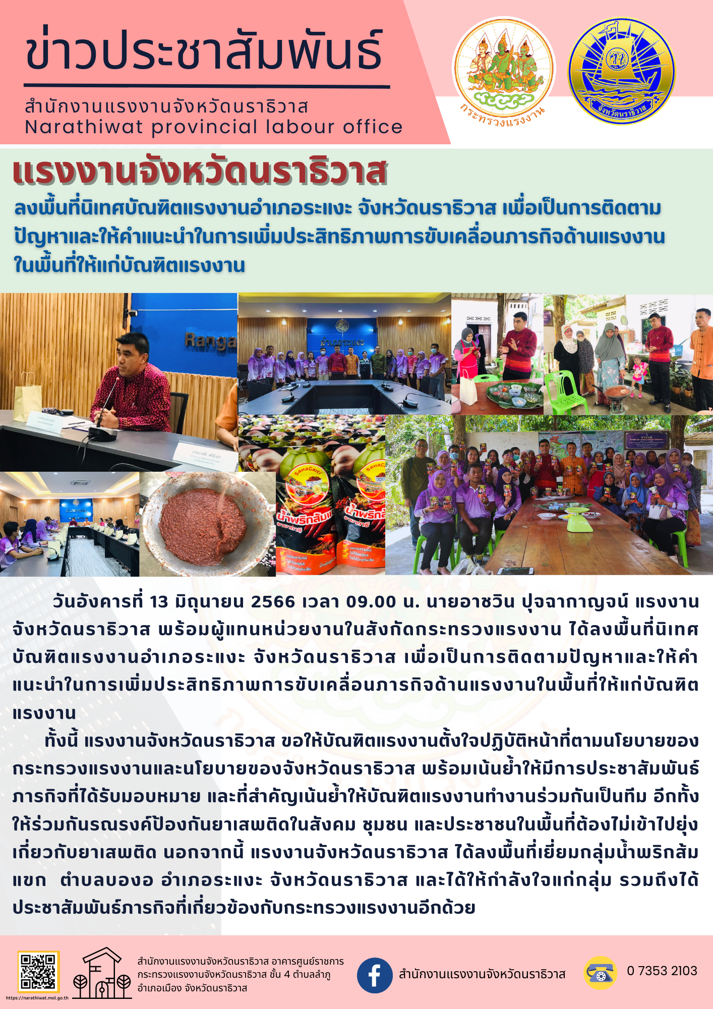 วันอังคารที่ 13 มิถุนายน 2566 เวลา 09.00 น. นายอาชวิน ปุจฉากาญจน์ แรงงานจังหวัดนราธิวาส พร้อมผู้แทนหน่วยงานในสังกัดกระทรวงแรงงาน ได้ลงพื้นที่นิเทศบัณฑิตแรงงานอำเภอระแงะ จังหวัดนราธิวาส เพื่อเป็นการติดตามปัญหาและให้คำแนะนำในการเพิ่มประสิทธิภาพการขับเคลื่อนภารกิจด้านแรงงานในพื้นที่ให้แก่บัณฑิตแรงงาน ทั้งนี้ แรงงานจังหวัดนราธิวาส ขอให้บัณฑิตแรงงานตั้งใจปฏิบัติหน้าที่ตามนโยบายของกระทรวงแรงงานและนโยบายของจังหวัดนราธิวาสพร้อมเน้นย้ำให้มีการประชาสัมพันธ์ภารกิจที่ได้รับมอบหมาย และที่สำคัญเน้นย้ำให้บัณฑิตแรงงานทำงานร่วมกันเป็นทีม อีกทั้งให้ร่วมกันรณรงค์ป้องกันยาเสพติดในสังคม ชุมชน และประชาชนในพื้นที่ต้องไม่เข้าไปยุ่งเกี่ยวกับยาเสพติด นอกจากนี้ แรงงานจังหวัดนราธิวาส ได้ลงพื้นที่เยี่ยมกลุ่มน้ำพริกส้มแขก ตำบลบองอ อำเภอระแงะ จังหวัดนราธิวาส และได้ให้กำลังใจแก่กลุ่ม รวมถึงได้ประชาสัมพันธ์ภารกิจที่เกี่ยวข้องกับกระทรวงแรงงานอีกด้วย