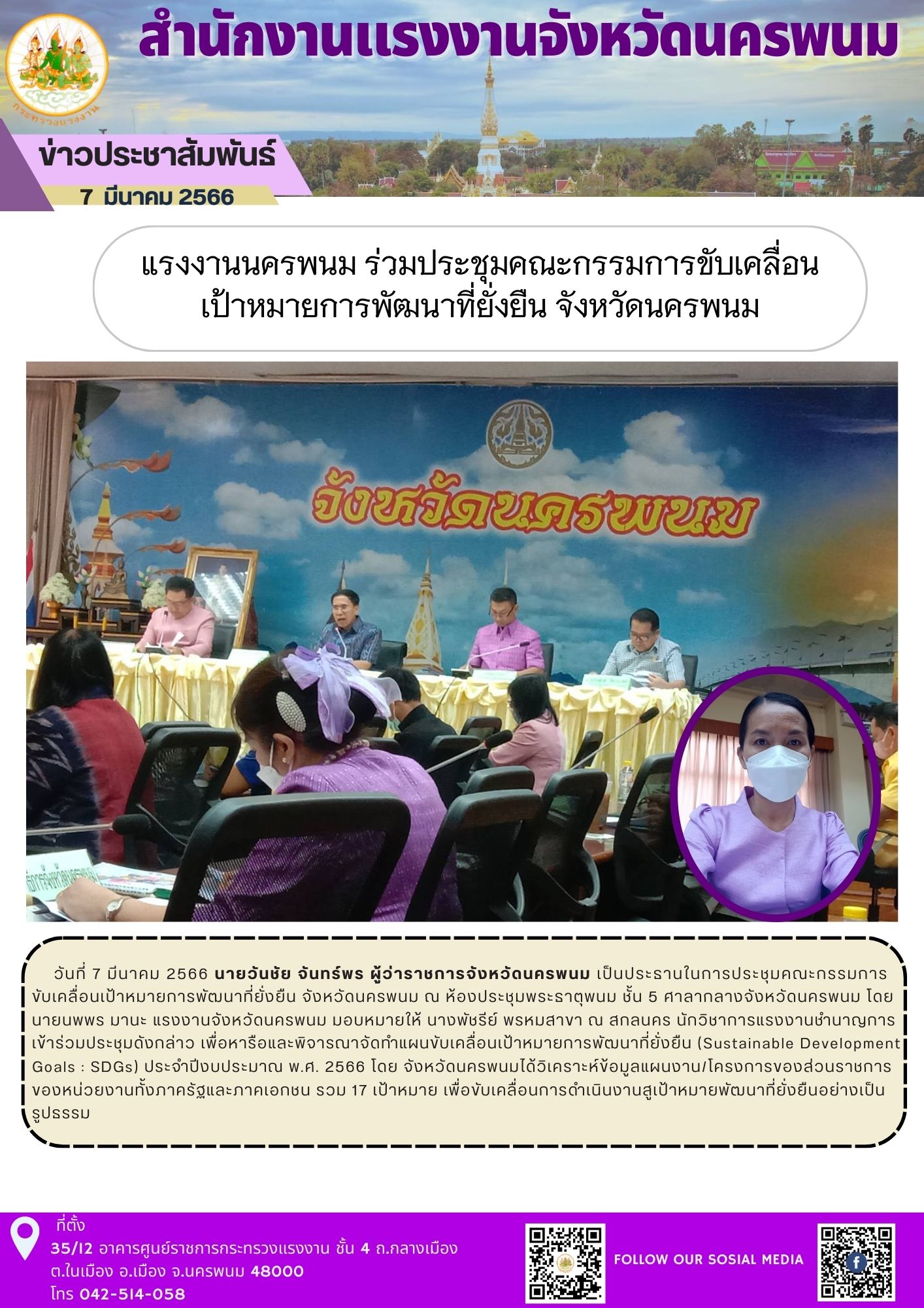 วันที่ 7 มีนาคม 2566 นายวันชัย จันทร์พร ผู้ว่าราชการจังหวัดนครพนม เป็นประธานในการประชุมคณะกรรมการขับเคลื่อนเป้าหมายการพัฒนาที่ยั่งยืน จังหวัดนครพนม ณ ห้องประชุมพระธาตุพนม ชั้น 5 ศาลากลางจังหวัดนครพนม โดย นายนพพร มานะ แรงงานจังหวัดนครพนม มอบหมายให้ นางพัชรีย์ พรหมสาขา ณ สกลนคร นักวิชาการแรงงานชำนาญการ เข้าร่วมประชุมดังกล่าว เพื่อหารือและพิจารณาจัดทำแผนขับเคลื่อนเป้าหมายการพัฒนาที่ยั่งยืน (Sustainable Development Goals : SDGs) ประจำปีงบประมาณ พ.ศ. 2566 โดย จังหวัดนครพนมได้วิเคราะห์ข้อมูลแผนงาน/โครงการของส่วนราชการ ของหน่วยงานทั้งภาครัฐและภาคเอกชน รวม 17 เป้าหมาย เพื่อขับเคลื่อนการดำเนินงานสูเป้าหมายพัฒนาที่ยั่งยืนอย่างเป็นรูปธรรม