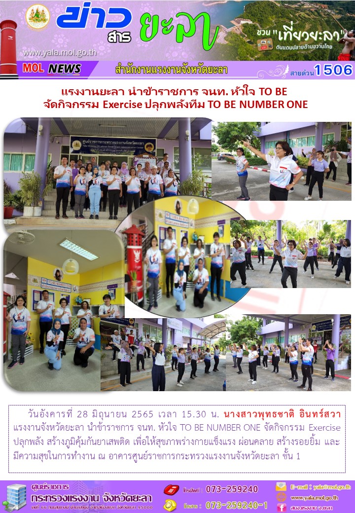 แรงงานยะลา นำข้าราชการ เจ้าหน้าที่ หัวใจ TO BE NUMBER ONE จัดกิจกรรม Exercise ปลุกพลังทีม TO BE NUMBER ONE