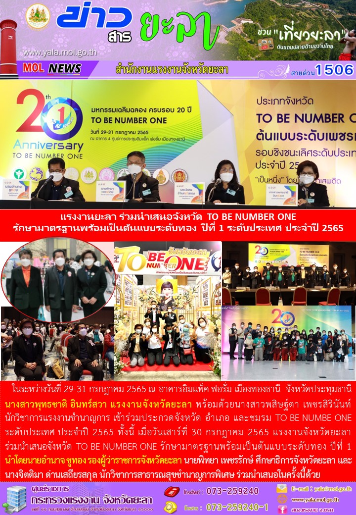 แรงงานยะลา ร่วมนำเสนอจังหวัด TO BE NUMBER ONE รักษามาตรฐานพร้อมเป็นต้นแบบระดับทอง ปีที่ 1 ระดับประเทศ ประจำปี 2565
