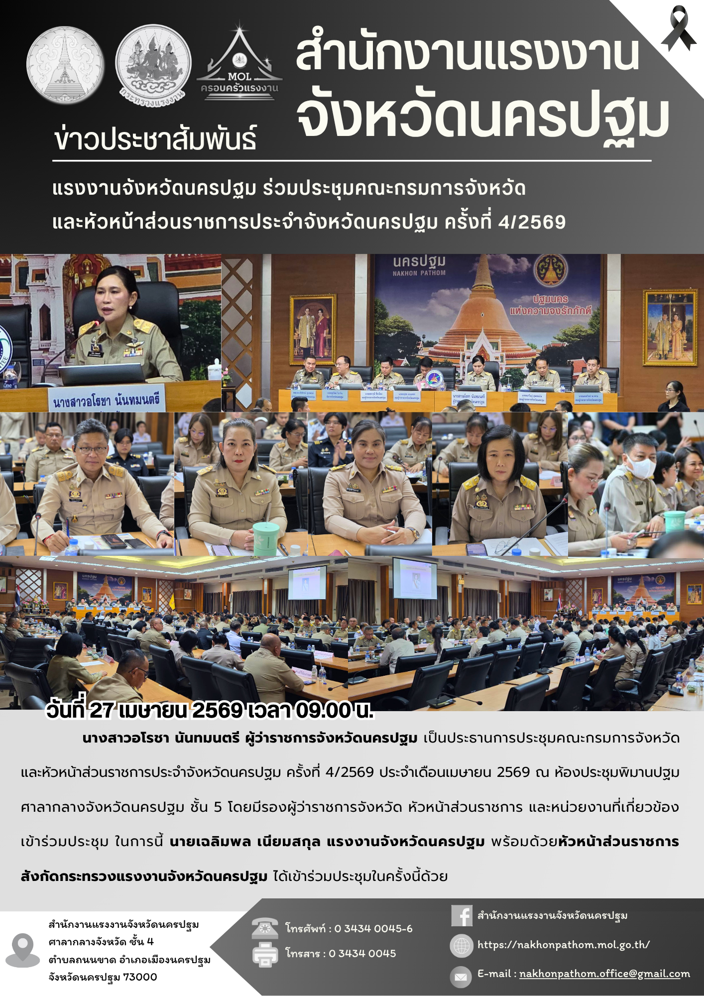 วันที่ 27 เมษายน 2569 เวลา 13.30 น. นางสุจินดา บุญแอ แรงงานจังหวัดสตูล ร่วมประชุมคณะกรมการจังหวัดและหัวหน้าส่วนราชการจังหวัดสตูล ครั้งที่ 4/2569 ผ่านสื่ออิเล็กทรอนิกส์ (Zoom Meeting) เพื่อรับมอบนโยบายตามข้อสั่งการของรัฐบาลและของจังหวัดให้ส่วนราชการไปดำเนินการให้เป็นไปในทิศทางเดียวกัน ณ ห้องประชุมสำนักงานแรงงานจังหวัดสตูล