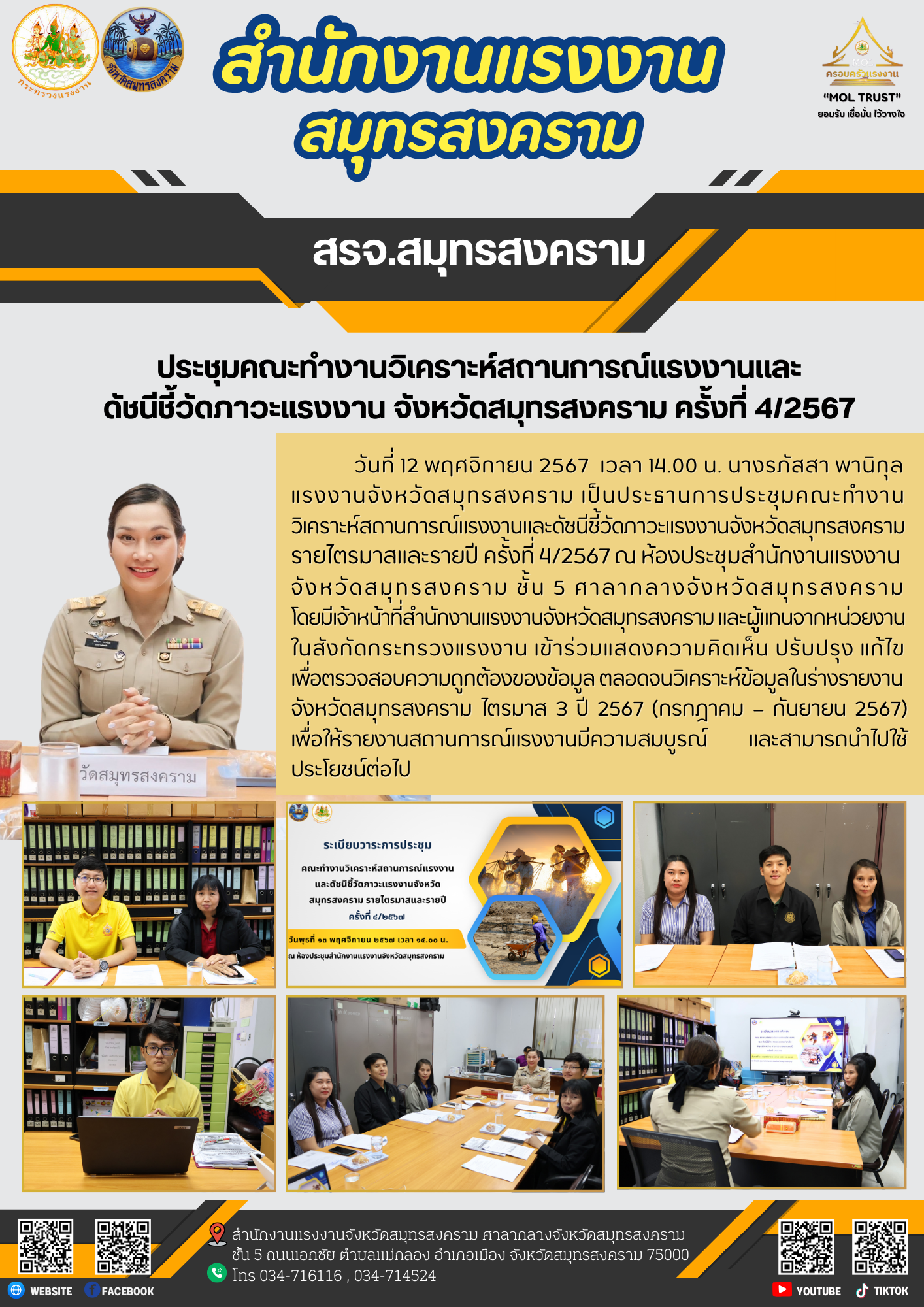 วันที่ 12 พฤศจิกายน 2567 เวลา 14.00 น. นางรภัสสา พานิกุล แรงงานจังหวัดสมุทรสงคราม เป็นประธานการประชุมคณะทำงานวิเคราะห์สถานการณ์แรงงานและดัชนีชี้วัดภาวะแรงงานจังหวัดสมุทรสงคราม รายไตรมาสและรายปี ครั้งที่ 4/2567 ณ ห้องประชุมสำนักงานแรงงานจังหวัดสมุทรสงคราม ชั้น 5 ศาลากลางจังหวัดสมุทรสงคราม โดยมีเจ้าหน้าที่สำนักงานแรงงานจังหวัดสมุทรสงคราม และผู้แทนจากหน่วยงานในสังกัดกระทรวงแรงงาน เข้าร่วมแสดงความคิดเห็น ปรับปรุง แก้ไข เพื่อตรวจสอบความถูกต้องของข้อมูล ตลอดจนวิเคราะห์ข้อมูลในร่างรายงานจังหวัดสมุทรสงคราม ไตรมาส 3 ปี 2567 (กรกฎาคม – กันยายน 2567) เพื่อให้รายงานสถานการณ์แรงงานมีความสมบูรณ์ และสามารถนำไปใช้ประโยชน์ต่อไป