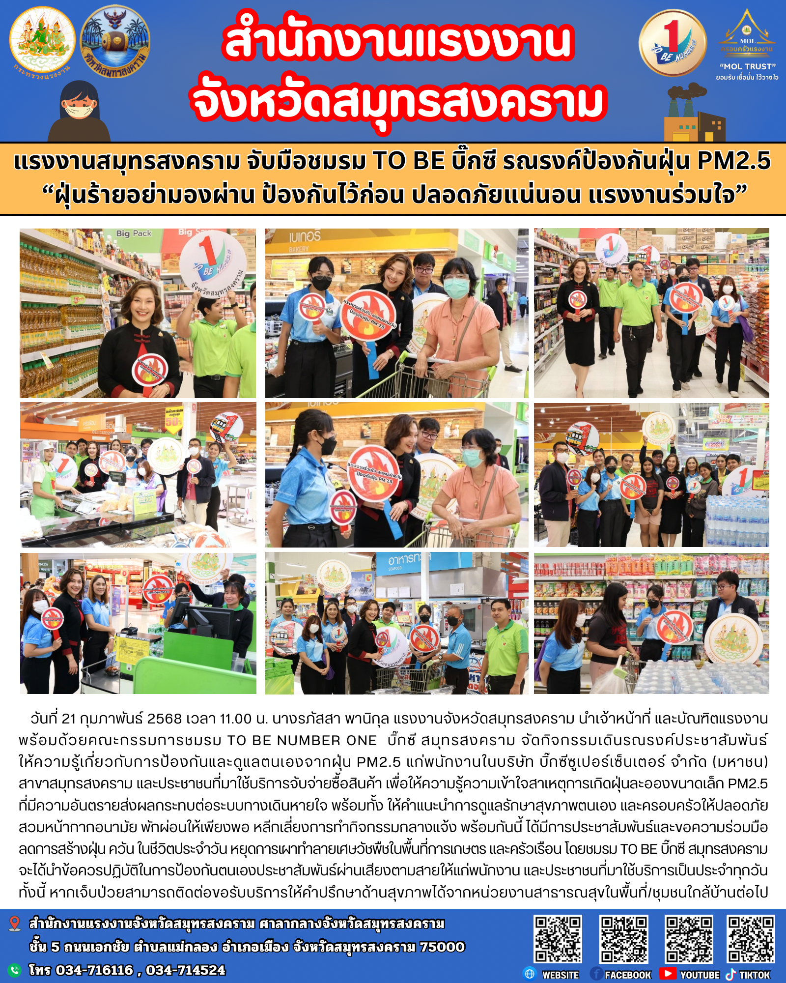 วันที่ 21 กุมภาพันธ์ 2568 เวลา 11.00 น. นางรภัสสา พานิกุล แรงงานจังหวัดสมุทรสงคราม นำเจ้าหน้าที่ และบัณฑิตแรงงาน พร้อมด้วยคณะกรรมการชมรม TO BE NUMBER ONE บิ๊กซี สมุทรสงคราม จัดกิจกรรมเดินรณรงค์ประชาสัมพันธ์ ให้ความรู้เกี่ยวกับการป้องกันและดูแลตนเองจากฝุ่น PM2.5 แก่พนักงานในบริษัท บิ๊กซีซูเปอร์เซ็นเตอร์ จำกัด (มหาชน) สาขาสมุทรสงคราม และประชาชนที่มาใช้บริการจับจ่ายซื้อสินค้า เพื่อให้ความรู้ความเข้าใจสาเหตุการเกิดฝุ่นละอองขนาดเล็ก PM2.5 ที่มีความอันตรายส่งผลกระทบต่อระบบทางเดินหายใจ พร้อมทั้ง ให้คำแนะนำการดูแลรักษาสุขภาพตนเอง และครอบครัวให้ปลอดภัย สวมหน้ากากอนามัย พักผ่อนให้เพียงพอ หลีกเลี่ยงการทำกิจกรรมกลางแจ้ง พร้อมกันนี้ ได้มีการประชาสัมพันธ์และขอความร่วมมือ ลดการสร้างฝุ่น ควัน ในชีวิตประจำวัน หยุดการเผาทำลายเศษวัชพืชในพื้นที่การเกษตร และครัวเรือน โดยชมรม TO BE บิ๊กซี สมุทรสงคราม จะได้นำข้อควรปฏิบัติในการป้องกันตนเองประชาสัมพันธ์ผ่านเสียงตามสายให้แก่พนักงาน และประชาชนที่มาใช้บริการเป็นประจำทุกวัน ทั้งนี้ หากเจ็บป่วยสามารถติดต่อขอรับบริการให้คำปรึกษาด้านสุขภาพได้จากหน่วยงานสาธารณสุขในพื้นที่/ชุมชนใกล้บ้านต่อไป