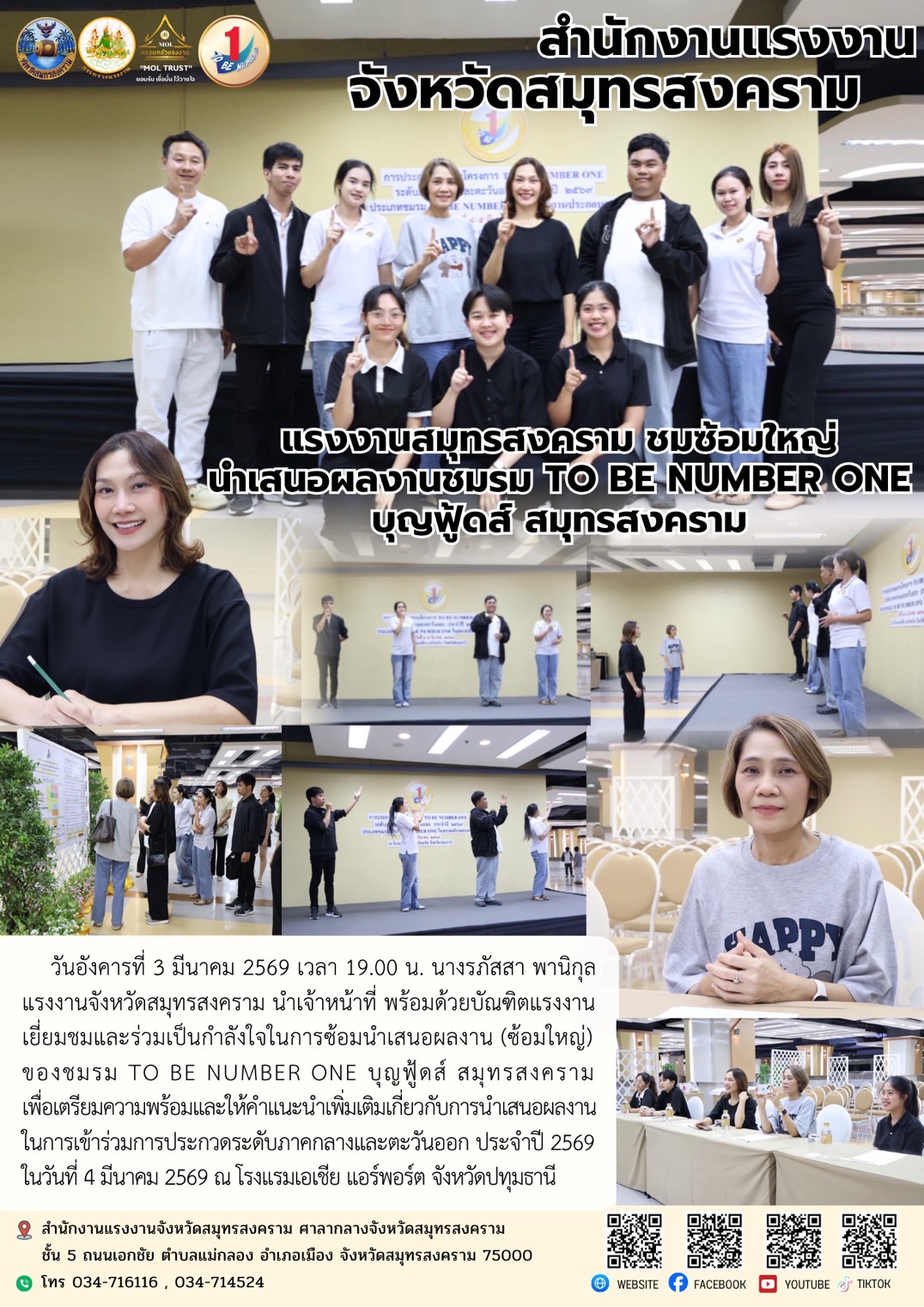 วันอังคารที่ 3 มีนาคม 2569 เวลา 19.00 น. นางรภัสสา พานิกุล แรงงานจังหวัดสมุทรสงคราม นำเจ้าหน้าที่ พร้อมด้วยบัณฑิตแรงงาน เยี่ยมชมและร่วมเป็นกำลังใจในการซ้อมนำเสนอผลงาน (ซ้อมใหญ่) ของชมรม TO BE NUMBER ONE บุญฟู้ดส์ สมุทรสงคราม เพื่อเตรียมความพร้อมและให้คำแนะนำเพิ่มเติมเกี่ยวกับการนำเสนอผลงานในการเข้าร่วมการประกวดระดับภาคกลางและตะวันออก ประจำปี 2569 ในวันที่ 4 มีนาคม 2569 ณ โรงแรมเอเชีย แอร์พอร์ต จังหวัดปทุมธานี