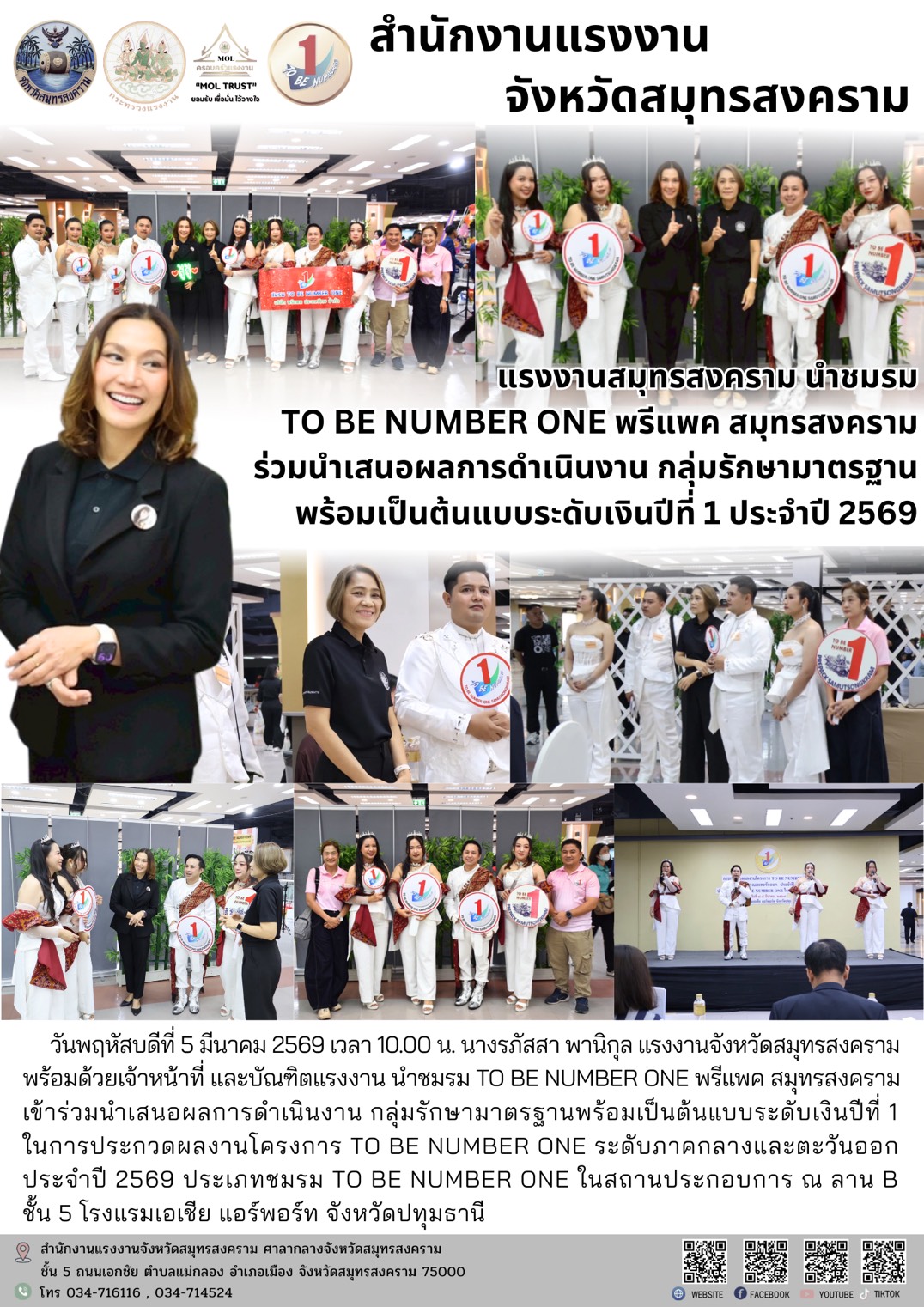 วันพฤหัสบดีที่ 5 มีนาคม 2569 เวลา 10.00 น. นางรภัสสา พานิกุล แรงงานจังหวัดสมุทรสงคราม พร้อมด้วยเจ้าหน้าที่ และบัณฑิตแรงงาน นำชมรม TO BE NUMBER ONE พรีแพค สมุทรสงคราม เข้าร่วมนำเสนอผลการดำเนินงาน กลุ่มรักษามาตรฐานพร้อมเป็นต้นแบบระดับเงินปีที่ 1 ในการประกวดผลงานโครงการ TO BE NUMBER ONE ระดับภาคกลางและตะวันออก ประจำปี 2569 ประเภทชมรม TO BE NUMBER ONE ในสถานประกอบการ ณ ลาน B ชั้น 5 โรงแรมเอเชีย แอร์พอร์ท จังหวัดปทุมธานี