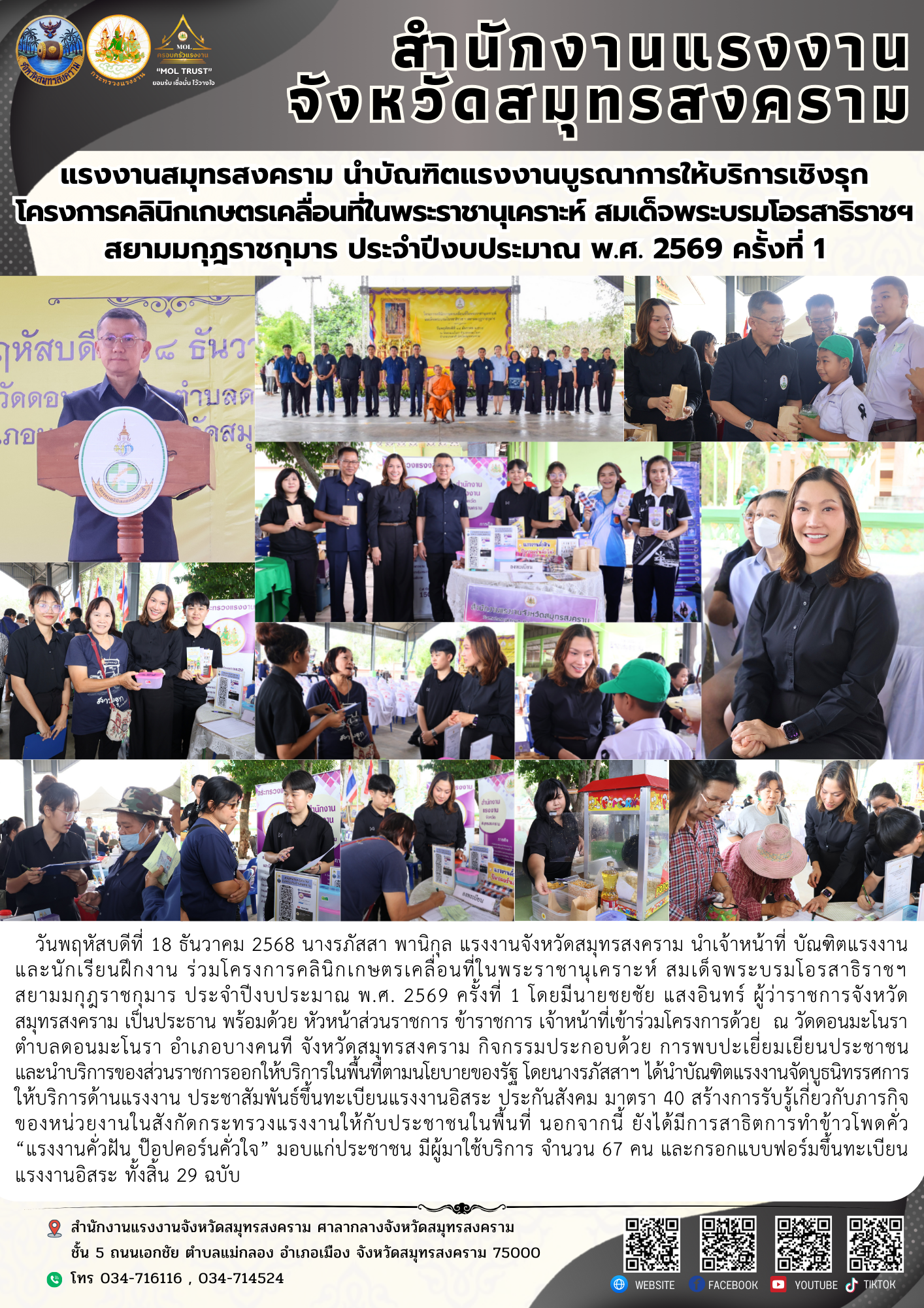วันพฤหัสบดีที่ 18 ธันวาคม 2568 นางรภัสสา พานิกุล แรงงานจังหวัดสมุทรสงคราม นำเจ้าหน้าที่ บัณฑิตแรงงานและนักเรียนฝึกงาน ร่วมโครงการคลินิกเกษตรเคลื่อนที่ในพระราชานุเคราะห์ สมเด็จพระบรมโอรสาธิราชฯสยามมกุฎราชกุมาร ประจำปีงบประมาณ พ.ศ. 2569 ครั้งที่ 1 โดยมีนายชยชัย แสงอินทร์ ผู้ว่าราชการจังหวัดสมุทรสงคราม เป็นประธาน พร้อมด้วย หัวหน้าส่วนราชการ ข้าราชการ เจ้าหน้าที่เข้าร่วมโครงการด้วย ณ วัดดอนมะโนราตำบลดอนมะโนรา อำเภอบางคนที จังหวัดสมุทรสงคราม กิจกรรมประกอบด้วย การพบปะเยี่ยมเยียนประชาชน และนำบริการของส่วนราชการออกให้บริการในพื้นที่ตามนโยบายของรัฐ โดยนางรภัสสาฯ ได้นำบัณฑิตแรงงานจัดบูธนิทรรศการให้บริการด้านแรงงาน ประชาสัมพันธ์ขึ้นทะเบียนแรงงานอิสระ ประกันสังคม มาตรา 40 สร้างการรับรู้เกี่ยวกับภารกิจของหน่วยงานในสังกัดกระทรวงแรงงานให้กับประชาชนในพื้นที่ นอกจากนี้ ยังได้มีการสาธิตการทำข้าวโพดคั่ว “แรงงานคั่วฝัน ป๊อปคอร์นคั่วใจ” มอบแก่ประชาชน มีผู้มาใช้บริการ จำนวน 67 คน และกรอกแบบฟอร์มขึ้นทะเบียนแรงงานอิสระ ทั้งสิ้น 29 ฉบับ