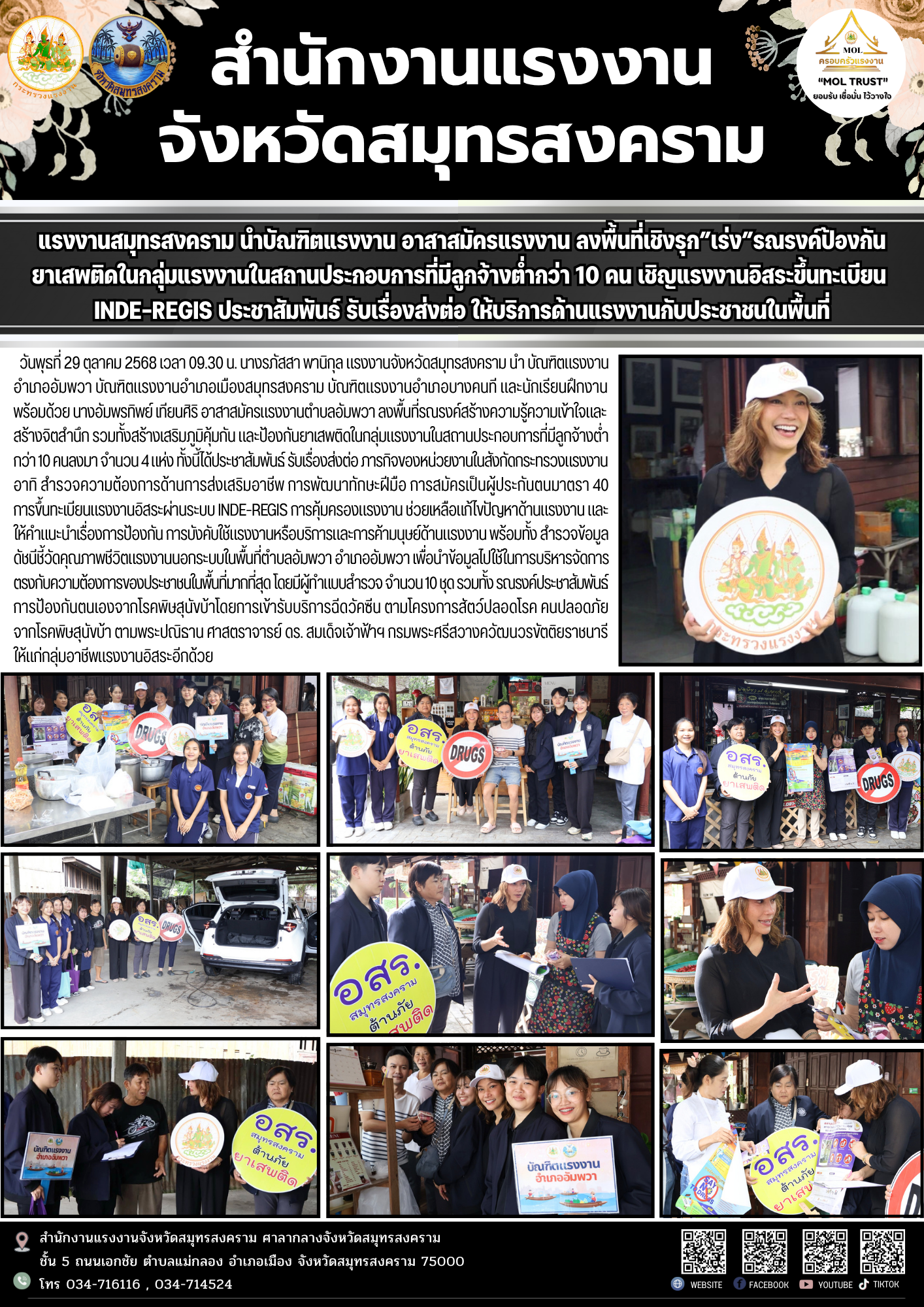 วันพุธที่ 29 ตุลาคม 2568 เวลา 09.30 น. นางรภัสสา พานิกุล แรงงานจังหวัดสมุทรสงคราม นำ บัณฑิตแรงงานอำเภออัมพวา บัณฑิตแรงงานอำเภอเมืองสมุทรสงคราม บัณฑิตแรงงานอำเภอบางคนที และนักเรียนฝึกงาน พร้อมด้วย นางอัมพรทิพย์ เทียนศิริ อาสาสมัครแรงงานตำบลอัมพวา ลงพื้นที่รณรงค์สร้างความรู้ความเข้าใจและสร้างจิตสำนึก รวมทั้งสร้างเสริมภูมิคุ้มกัน และป้องกันยาเสพติดในกลุ่มแรงงานในสถานประกอบการที่มีลูกจ้างต่ำกว่า 10 คนลงมา จำนวน 4 แห่ง ทั้งนี้ได้ประชาสัมพันธ์ รับเรื่องส่งต่อ ภารกิจของหน่วยงานในสังกัดกระทรวงแรงงาน อาทิ สำรวจความต้องการด้านการส่งเสริมอาชีพ การพัฒนาทักษะฝีมือ การสมัครเป็นผู้ประกันตนมาตรา 40 การขึ้นทะเบียนแรงงานอิสระผ่านระบบ INDE-REGIS การคุ้มครองแรงงาน ช่วยเหลือแก้ไขปัญหาด้านแรงงาน และให้คำแนะนำเรื่องการป้องกัน การบังคับใช้แรงงานหรือบริการและการค้ามนุษย์ด้านแรงงาน พร้อมทั้ง สำรวจข้อมูลดัชนีชี้วัดคุณภาพชีวิตแรงงานนอกระบบในพื้นที่ตำบลอัมพวา อำเภออัมพวา เพื่อนำข้อมูลไปใช้ในการบริหารจัดการตรงกับความต้องการของประชาชนในพื้นที่มากที่สุด โดยมีผู้ทำแบบสำรวจ จำนวน 10 ชุด รวมทั้ง รณรงค์ประชาสัมพันธ์การป้องกันตนเองจากโรคพิษสุนัขบ้าโดยการเข้ารับบริการฉีดวัคซีน ตามโครงการสัตว์ปลอดโรค คนปลอดภัยจากโรคพิษสุนัขบ้า ตามพระปณิธาน ศาสตราจารย์ ดร. สมเด็จเจ้าฟ้าฯ กรมพระศรีสวางควัฒนวรขัตติยราชนารี ให้แก่กลุ่มอาชีพแรงงานอิสระอีกด้วย