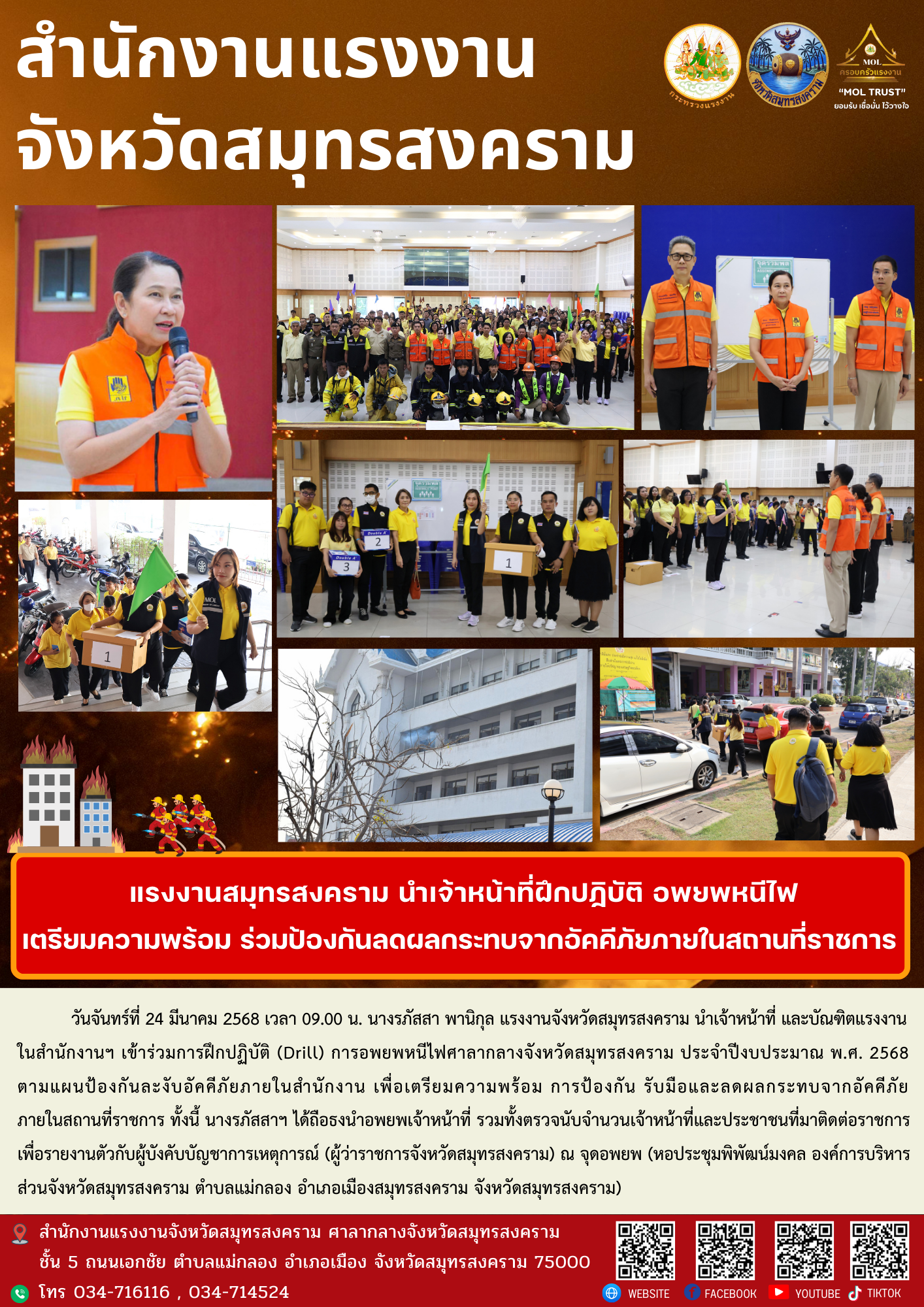 วันจันทร์ที่ 24 มีนาคม 2568 เวลา 09.00 น. นางรภัสสา พานิกุล แรงงานจังหวัดสมุทรสงคราม นำเจ้าหน้าที่ และบัณฑิตแรงงานในสำนักงานฯ เข้าร่วมการฝึกปฏิบัติ (Drill) การอพยพหนีไฟศาลากลางจังหวัดสมุทรสงคราม ประจำปีงบประมาณ พ.ศ. 2568 ตามแผนป้องกันละงับอัคคีภัยภายในสำนักงาน เพื่อเตรียมความพร้อม การป้องกัน รับมือและลดผลกระทบจากอัคคีภัยภายในสถานที่ราชการ ทั้งนี้ นางรภัสสาฯ ได้ถือธงนำอพยพเจ้าหน้าที่ รวมทั้งตรวจนับจำนวนเจ้าหน้าที่และประชาชนที่มาติดต่อราชการ เพื่อรายงานตัวกับผู้บังคับบัญชาการเหตุการณ์ (ผู้ว่าราชการจังหวัดสมุทรสงคราม) ณ จุดอพยพ (หอประชุมพิพัฒน์มงคล องค์การบริหารส่วนจังหวัดสมุทรสงคราม ตำบลแม่กลอง อำเภอเมืองสมุทรสงคราม จังหวัดสมุทรสงคราม)