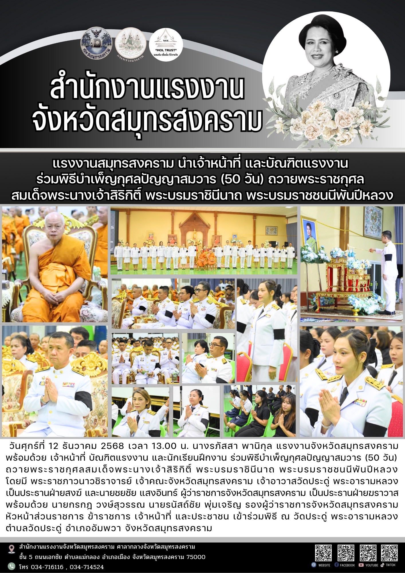 วันศุกร์ที่ 12 ธันวาคม 2568 เวลา 13.00 น. นางรภัสสา พานิกุล แรงงานจังหวัดสมุทรสงคราม พร้อมด้วย เจ้าหน้าที่ บัณฑิตแรงงาน และนักเรียนฝึกงาน ร่วมพิธีบำเพ็ญกุศลปัญญาสมวาร (50 วัน) ถวายพระราชกุศลสมเด็จพระนางเจ้าสิริกิติ์ พระบรมราชินีนาถ พระบรมราชชนนีพันปีหลวง โดยมี พระราชภาวนาวชิราจารย์ เจ้าคณะจังหวัดสมุทรสงคราม เจ้าอาวาสวัดประดู่ พระอารามหลวง เป็นประธานฝ่ายสงฆ์ และนายชยชัย แสงอินทร์ ผู้ว่าราชการจังหวัดสมุทรสงคราม เป็นประธานฝ่ายฆราวาส พร้อมด้วย นายกรกฎ