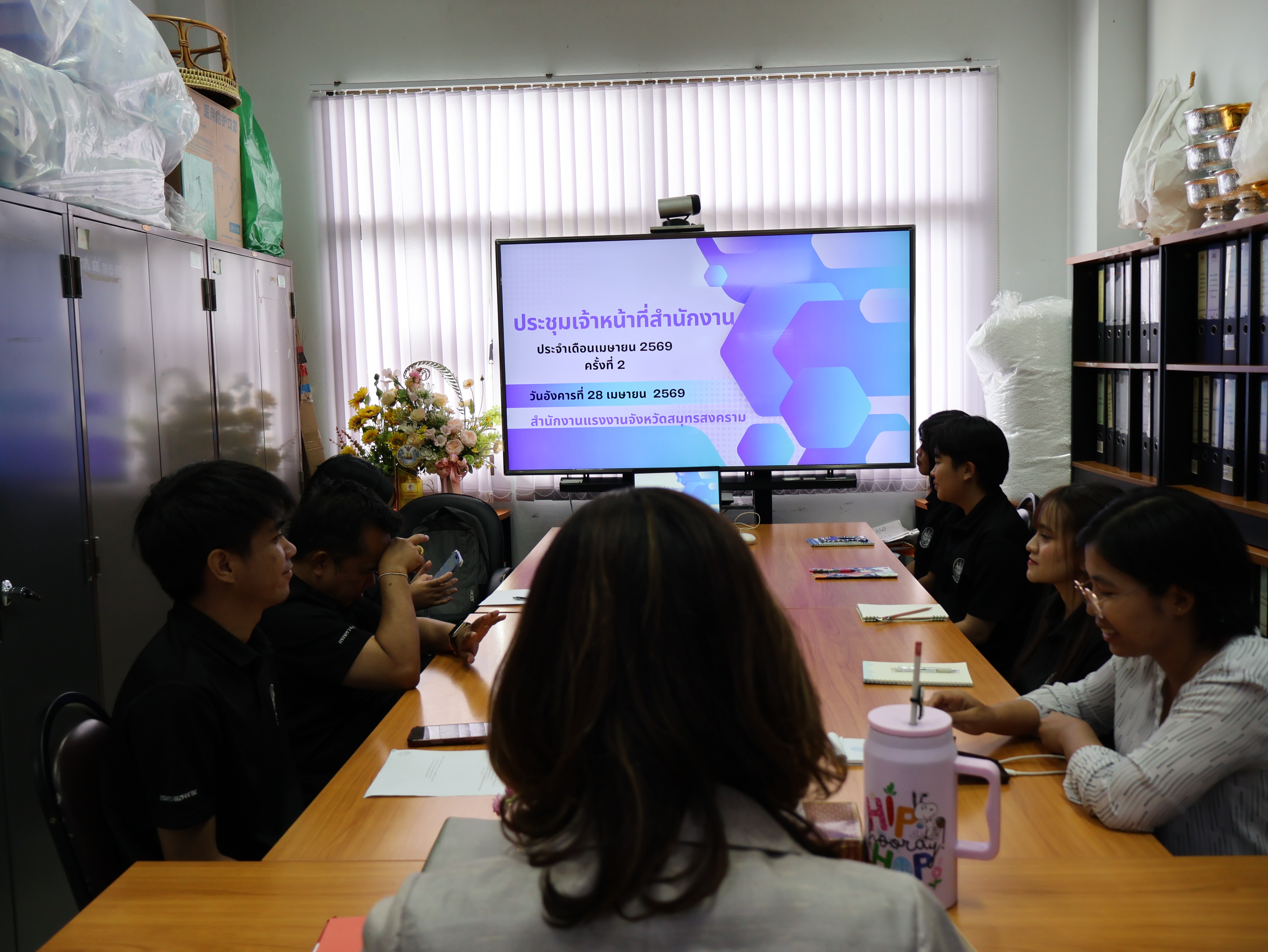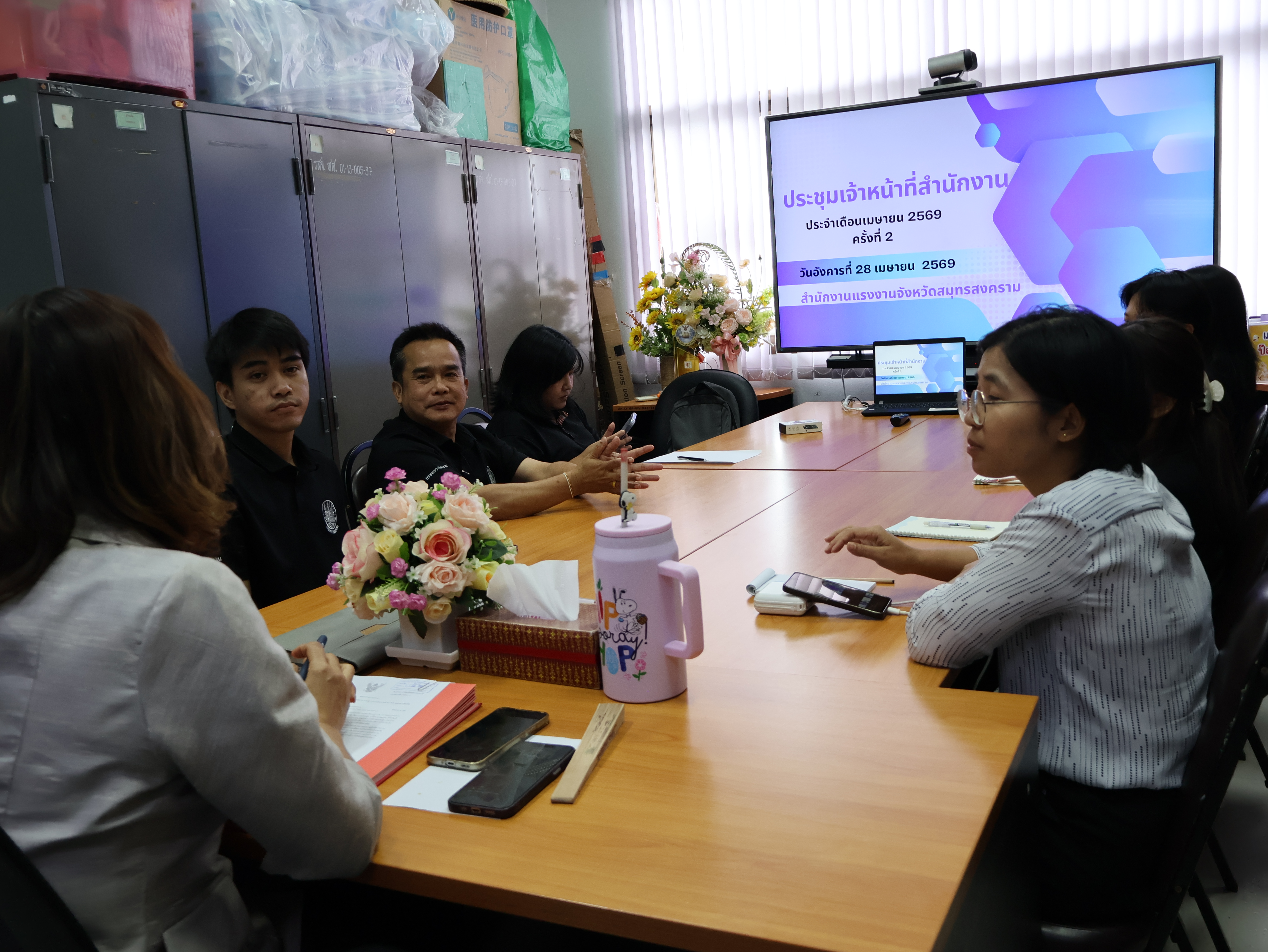 วันอังคารที่ 28 เมษายน 2569 เวลา 14.30 น. นางรภัสสา พานิกุล แรงงานจังหวัดสมุทรสงคราม เป็นประธานการประชุมเจ้าหน้าที่