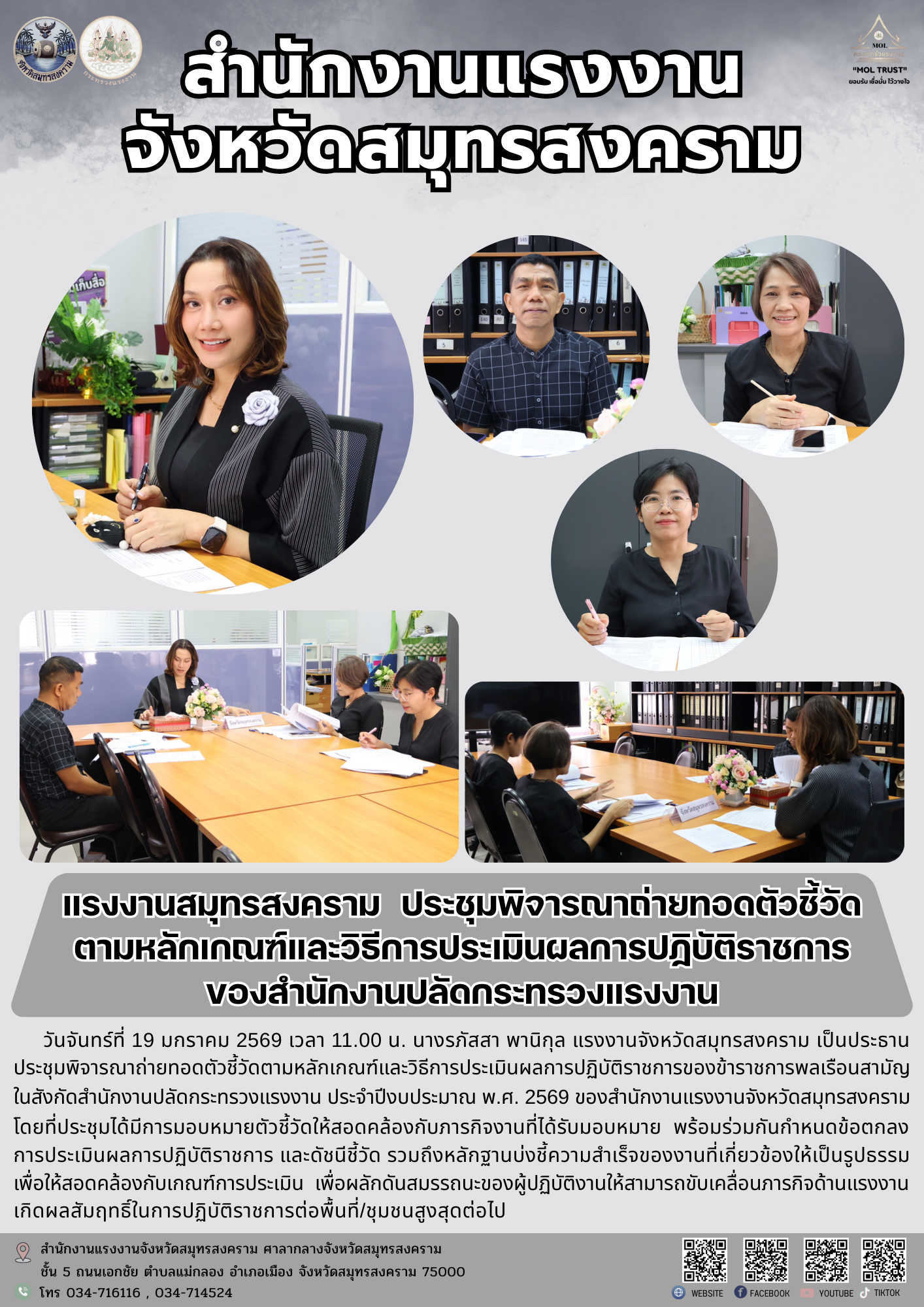 วันจันทร์ที่ 19 มกราคม 2569 เวลา 11.00 น. นางรภัสสา พานิกุล แรงงานจังหวัดสมุทรสงคราม เป็นประธานประชุมพิจารณาถ่ายทอดตัวชี้วัดตามหลักเกณฑ์และวิธีการประเมินผลการปฏิบัติราชการของข้าราชการพลเรือนสามัญในสังกัดสำนักงานปลัดกระทรวงแรงงาน ประจำปีงบประมาณ พ.ศ. 2569 ของสำนักงานแรงงานจังหวัดสมุทรสงคราม โดยที่ประชุมได้มีการมอบหมายตัวชี้วัดให้สอดคล้องกับภารกิจงานที่ได้รับมอบหมาย พร้อมร่วมกันกำหนดข้อตกลงการประเมินผลการปฏิบัติราชการ และดัชนีชี้วัด รวมถึงหลักฐานบ่งชี้ความสำเร็จของงานที่เกี่ยวข้องให้เป็นรูปธรรม เพื่อให้สอดคล้องกับเกณฑ์การประเมิน เพื่อผลักดันสมรรถนะของผู้ปฏิบัติงานให้สามารถขับเคลื่อนภารกิจด้านแรงงาน เกิดผลสัมฤทธิ์ในการปฏิบัติราชการต่อพื้นที่/ชุมชนสูงสุดต่อไป