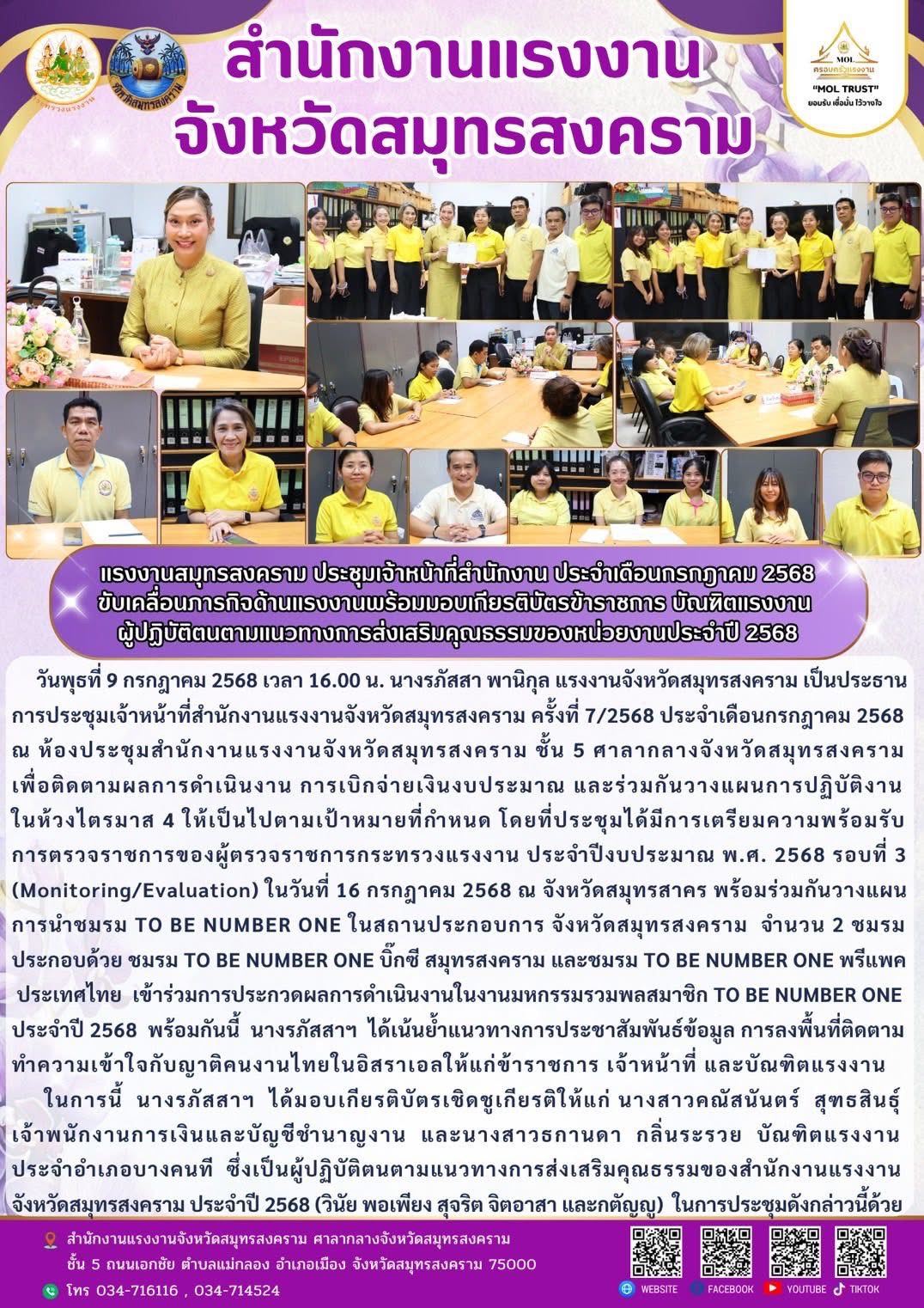 วันพุธที่ 9 กรกฎาคม 2568 เวลา 16.00 น. นางรภัสสา พานิกุล แรงงานจังหวัดสมุทรสงคราม เป็นประธาน
